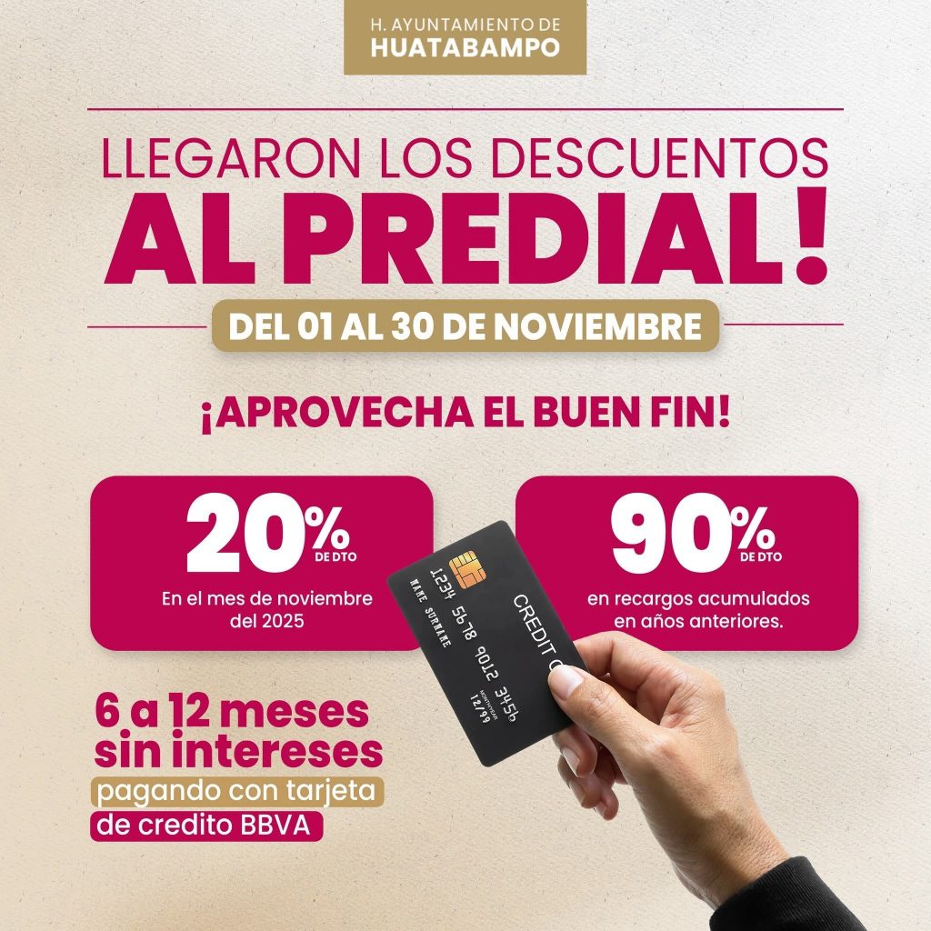 Del 1 al 30 de noviembre el Gobierno de Huatabampo te invita a aprovechar un 20% de descuento en tu pago y un 90% en recargos acumulados de años anteriores. 📆