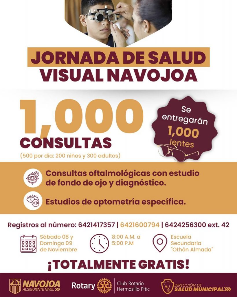 El Gobierno Municipal de Navojoa, a través de la Dirección de Salud Municipal, en coordinación con Club Rotario Hermosillo Pitic, te invita a participar en la Jornada de Salud Visual Navojoa, donde se ofrecerán 1,000 consultas oftalmológicas y optométricas totalmente gratuitas, además de la entrega de 1,000 lentes. 👓💛