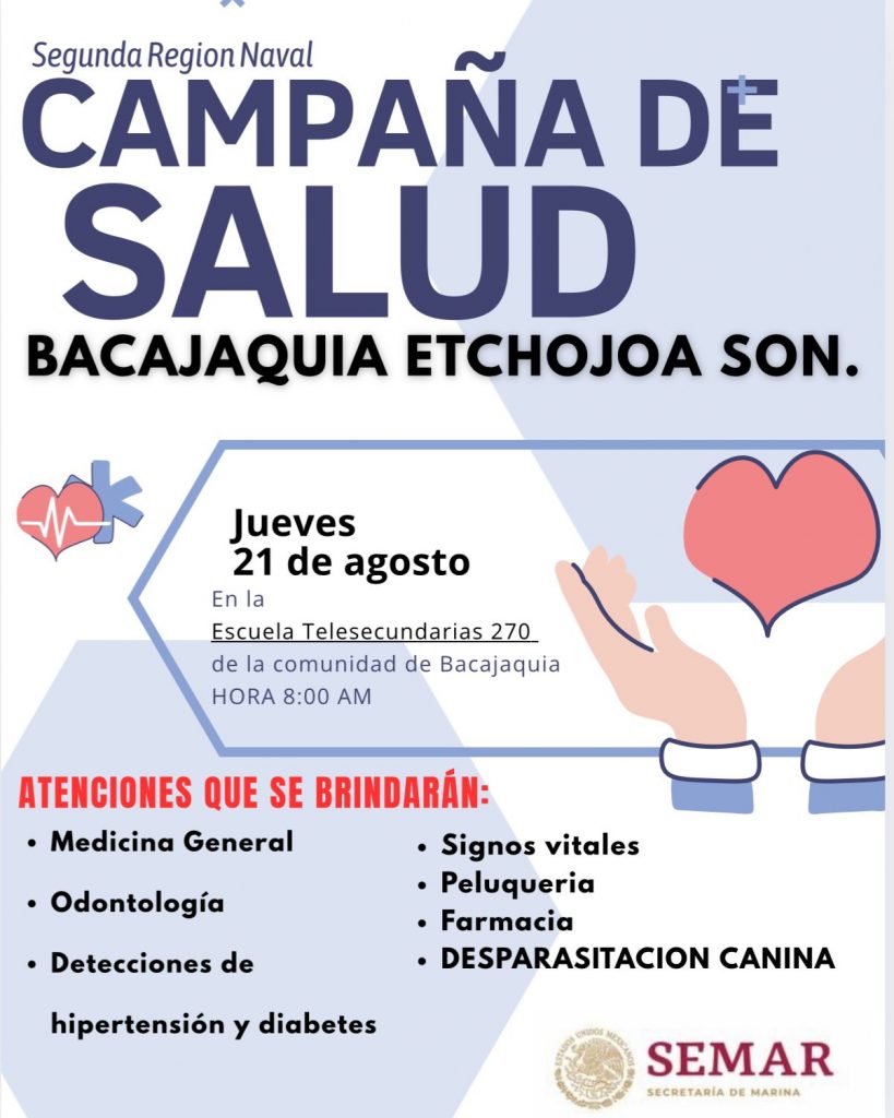El H. Ayuntamiento de Etchojoa, a través de la Dirección de Salud Municipal, en coordinación con la Secretaría de Marina (SEMAR) y la Secretaría de Salud Pública del Estado de Sonora, te invita a la Jornada Médica SEMAR.