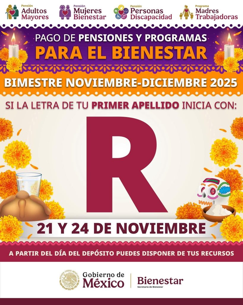 Hoy lunes 24 de noviembre continúa el pago correspondiente a quienes su primer apellido comienza con la letra R, de los programas: