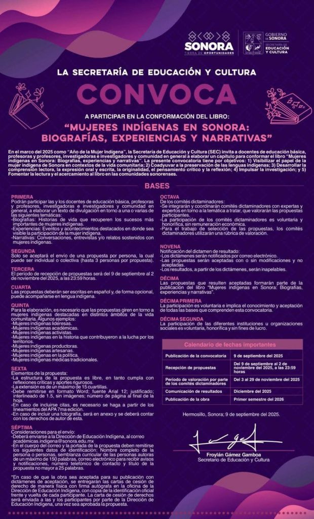 La Secretaría de Educación y Cultura invita a docentes de educación básica a participar en la convocatoria que busca dar voz y reconocimiento a la mujer indígena, resaltando sus aportes culturales, sociales e históricos en Sonora. 🙋🏻‍♀️