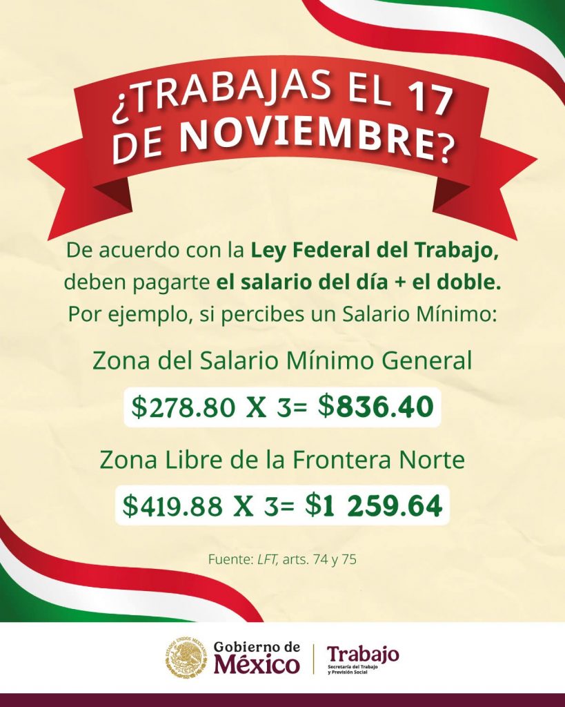 La Secretaría del Trabajo y Previsión Social informa que por ley, el 17 de noviembre es día de descanso obligatorio 📜, en conmemoración del 20 de noviembre, Día de la #RevoluciónMexicana. 🚂