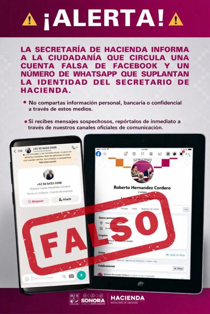 Se ha detectado una cuenta falsa de FACEBOOK, así como de línea de WHATSAPP que está suplantando la identidad del Secretario Secretaría de Hacienda Sonora.