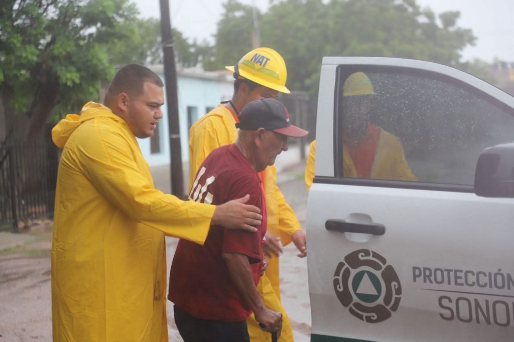 Personal de la Dirección de Atención a Emergencias y Desastres de la Coordinación Estatal de Protección Civil y de la Brigada Estatal de Manejo de Fuego de Sagarhpa y Protección Civil Sonora, realiza la evacuación preventiva de dos adultos mayores en el municipio de Navojoa, ante las intensas lluvias.