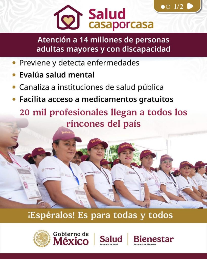 Gobierno de México, ¡Ya inició el programa Salud Casa por Casa! En los 32 estados del país, 20 mil profesionales visitan a personas adultas mayores y con discapacidad para brindar atención médica. Además, se despliegan 312 brigadas en 28 estados para llegar a las comunidades más apartadas.