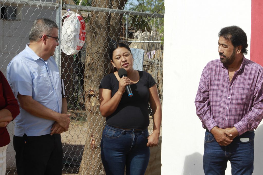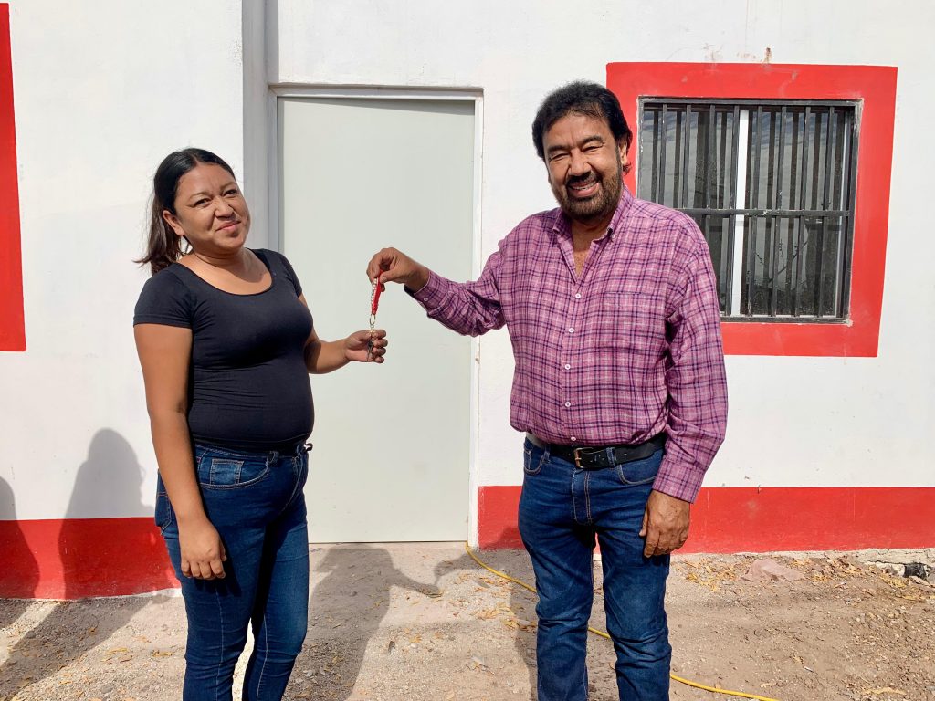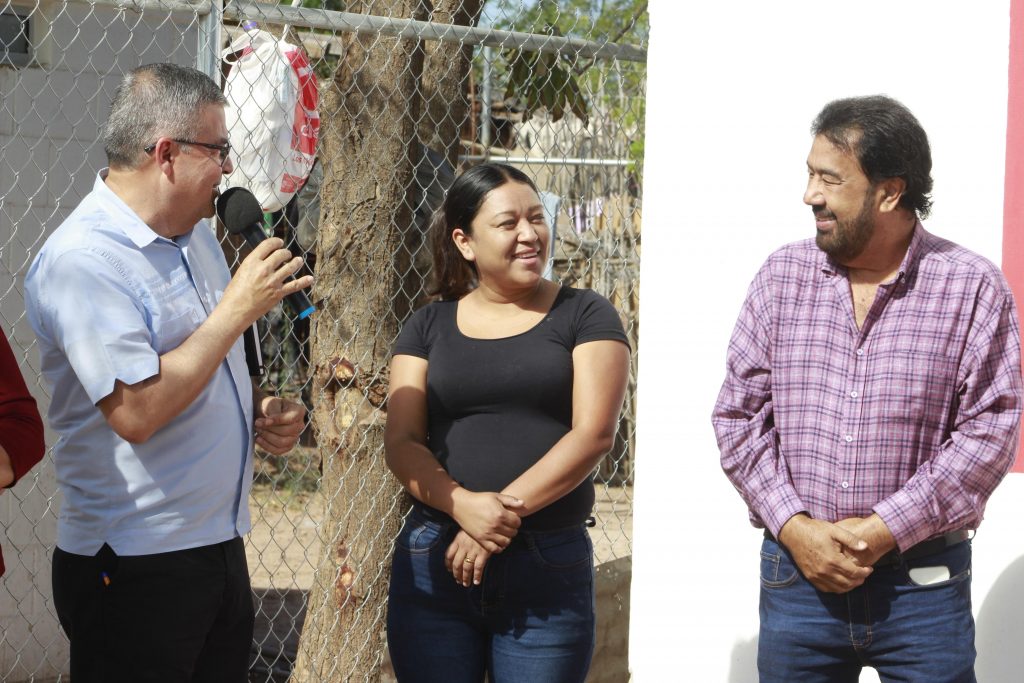 Etchojoa, Son.- En representación del gobernador Alfonso Durazo Montaño, el alcalde, Ing. Luis Arturo Robles Higuera, realizó la entrega de una vivienda a Carmen Patricia Cruz Gocobachi, madre soltera de cuatro hijos y residente de la colonia Nueva Esperanza, como parte de las acciones impulsadas por la Comisión Estatal de Vivienda (Coves Sonora).