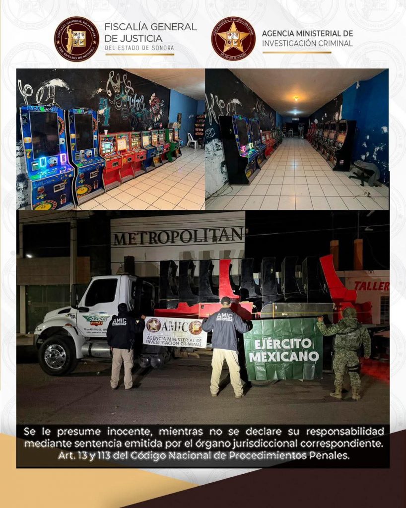 Hermosillo, Sonora, 20 de enero de 2026.- La Fiscalía General de Justicia del Estado de Sonora (FGJES), a través de la Agencia Ministerial de Investigación Criminal AMIC, Secretaría de Seguridad y Protección Ciudadana (SSPC), la Secretaría de la Defensa Nacional (DEFENSA) y la Policía Estatal de Seguridad Pública (PESP), realizó diversos operativos en la varios sitios del Estado que derivó en el aseguramiento de 78 máquinas tragamonedas.
