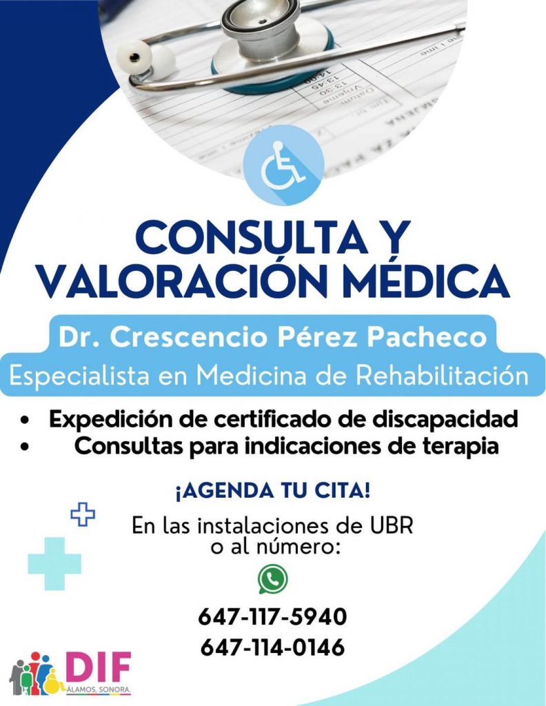 🔹Expedición de certificados de discapacidad y consultas para indicaciones de terapia con el Dr. Cresencio Pérez, Médico Especialista en Rehabilitación.