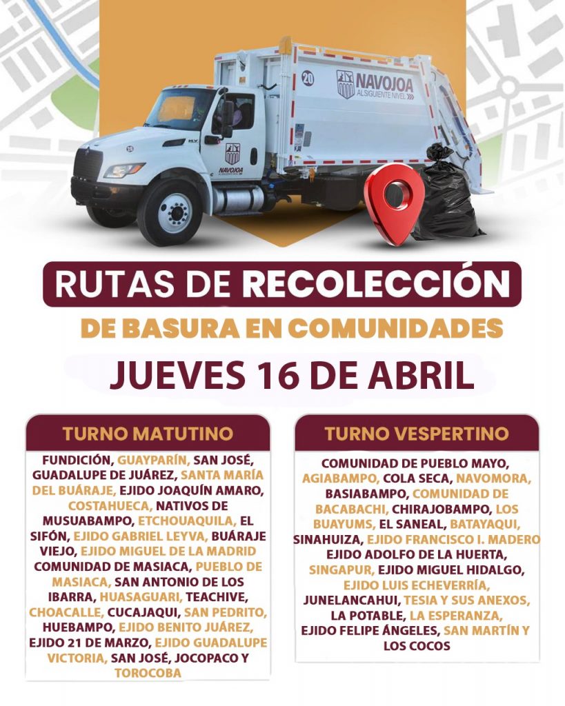 NAVOJOA PRINCIPAL SERVICIOS PÚBLICOS ATENCIÓN AMIGOS de las COMUNIDADES de Navojoa. Comparte esto: Comparte en Facebook (Se abre en una ventana nueva) Facebook Share on WhatsApp (Se abre en una ventana nueva) WhatsApp Share on X (Se abre en una ventana nueva) X Email a link to a friend (Se abre en una ventana nueva) Correo electrónico Luis Diaz Llamita abril 16, 2026 Lugares para la recolección de la basura para hoy jueves 16 de abril. Post navigation Previous Previous post: Pronóstico del TiempoCoordinación Estatal de Protección CivilNext Next post: Campaña, Dengue (Casa Limpia)”. Deja un comentario Cancelar respuestaTu dirección de correo electrónico no será publicada. Los campos obligatorios están marcados con *Comentario * Nombre * Correo electrónico * Web Guardar mi nombre, correo electrónico y sitio web en este navegador para la próxima vez que haga un comentario.
