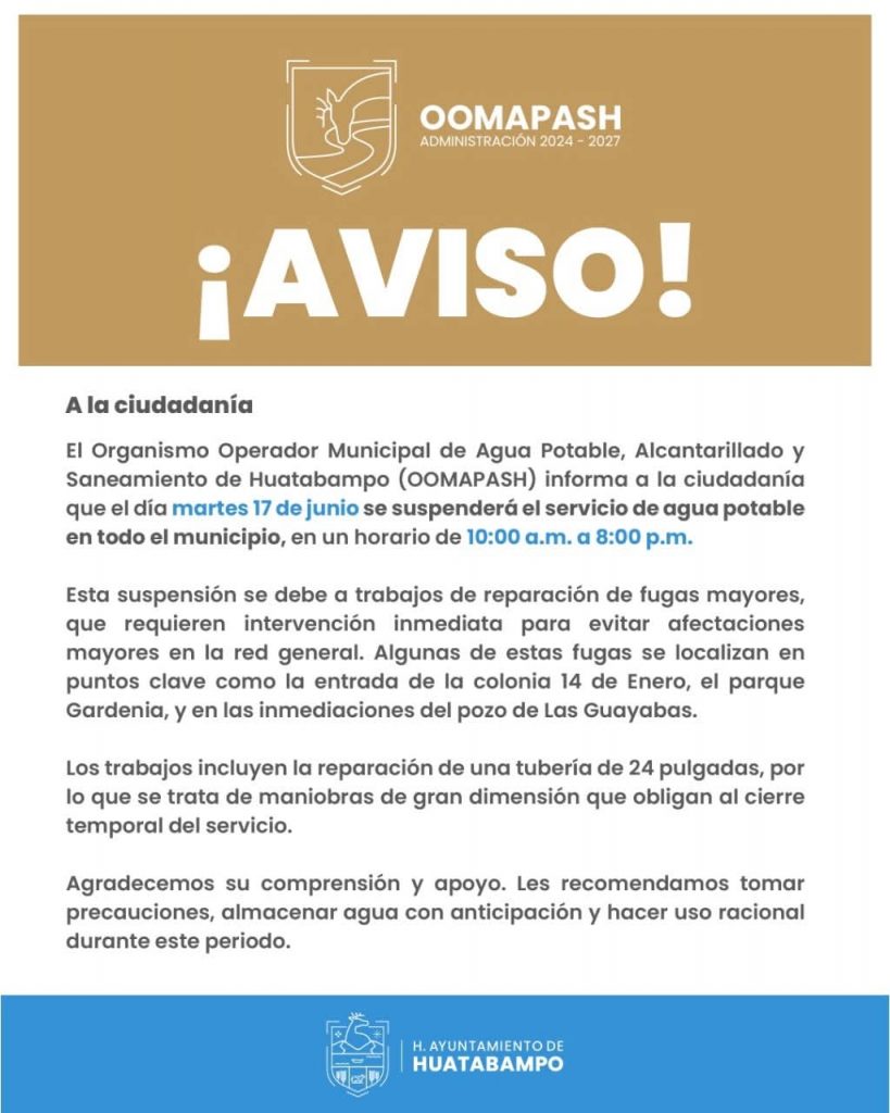 🚱 OOMAPASH Informama a la ciudadanía que este martes 17 de junio se suspenderá el servicio de agua por trabajos de reparación en varias zonas del municipio.