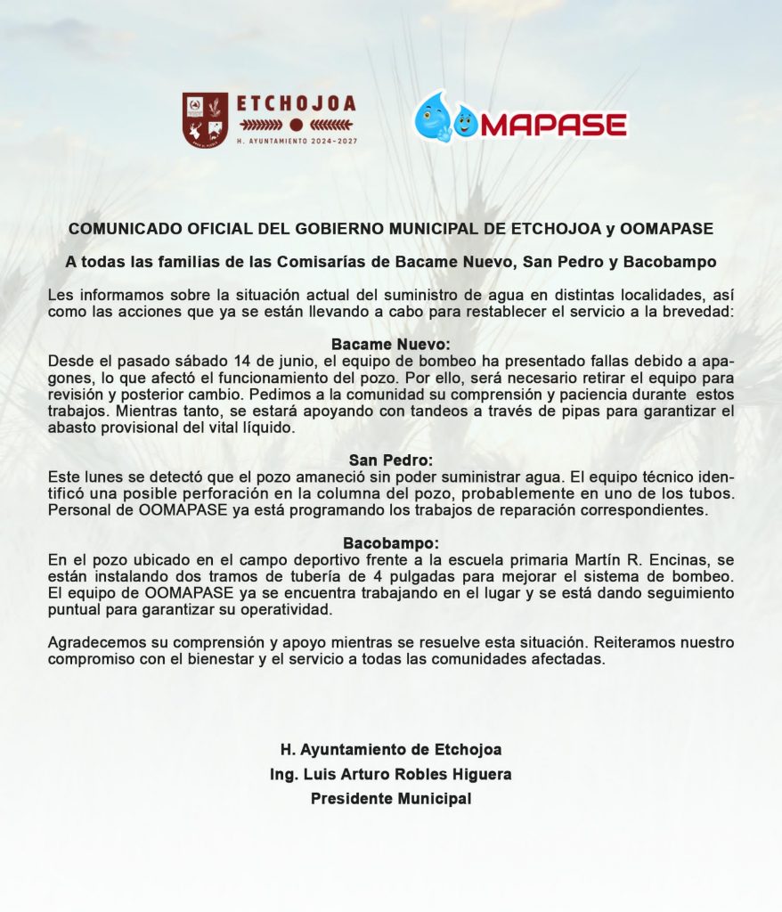 AGUA ETCHOJOA PRINCIPAL ATENCIÓN BACAME NUEVO, SAN PEDRO Y BACOBAMPO. luis diaz llamita junio 17, 2025 El H Ayuntamiento de de Etchojoa y Oomapase emiten comunicado a los etchojoenses. Continue Reading Previous Previous post: Gobernador Durazo posiciona a Sonora en el top 10 nacional de mayor crecimiento industrialNext Next post: EN HUATABAMPO RECARPETEAN CALLE NICOLAS BRAVO. Deja un comentario Cancelar respuestaTu dirección de correo electrónico no será publicada. Los campos obligatorios están marcados con *Comentario * Nombre * Correo electrónico * Web Guardar mi nombre, correo electrónico y sitio web en este navegador para la próxima vez que haga un comentario.