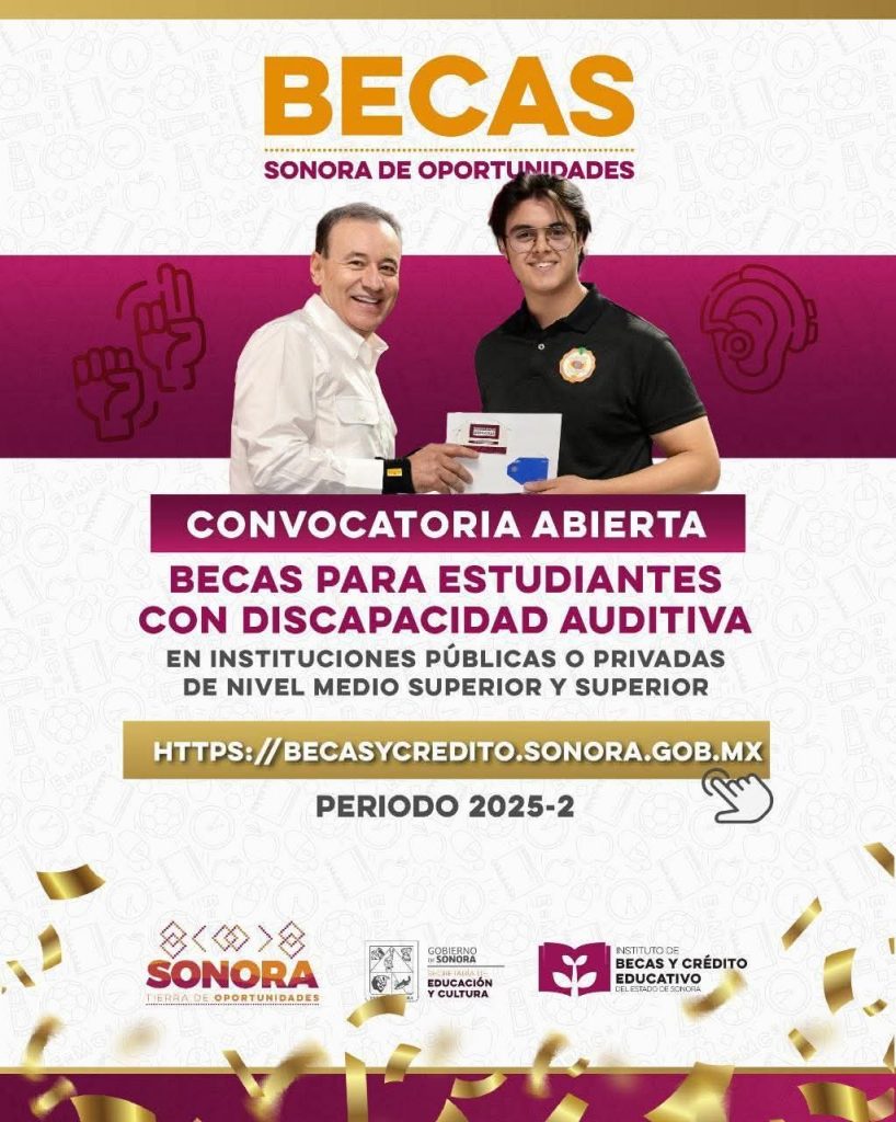 📚 ¡Ya está disponible la convocatoria de Becas Sonora de Oportunidades para estudiantes con discapacidad auditiva del nivel medio superior y superior para el periodo 2025-2!
