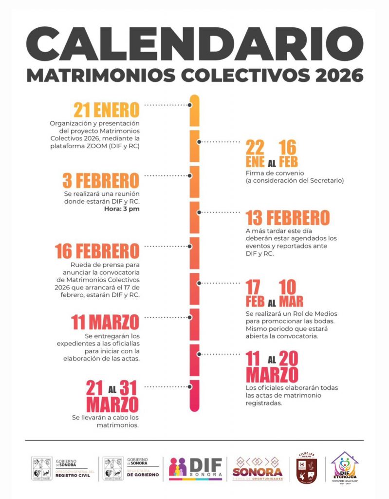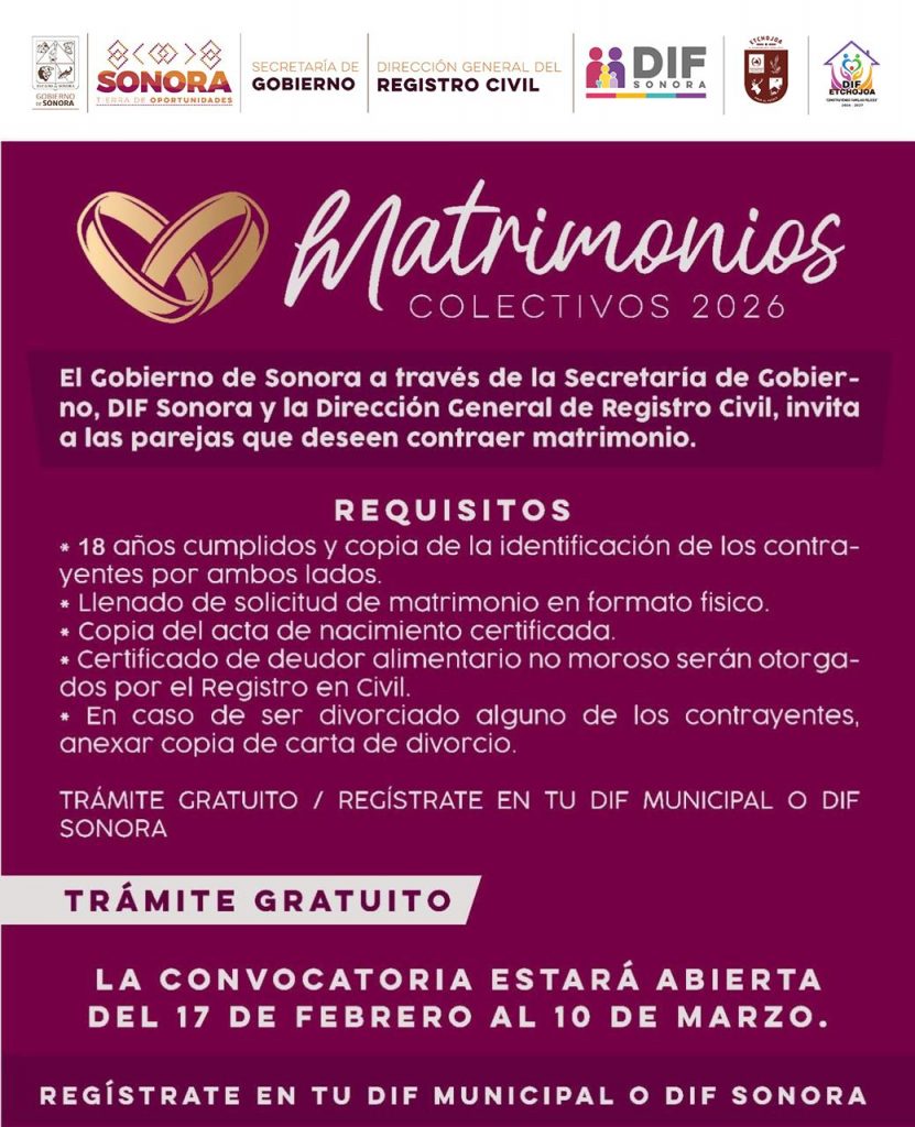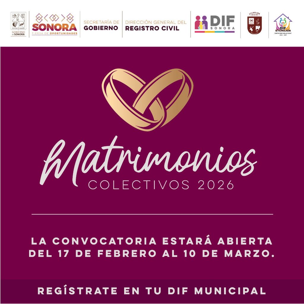 El Gobierno de Sonora a través de la Secretaría de Gobierno , el DIF Sonora, la Dirección General del Registro Civil y el Sistema Dif Etchojoa, que encabeza la profesora Karla Minú Cano Arce, invita a todas las parejas interesadas en formalizar su unión a participar en el programa Matrimonios Colectivos 2026, un trámite totalmente gratuito que busca brindar certeza jurídica y fortalecer a las familias sonorenses.