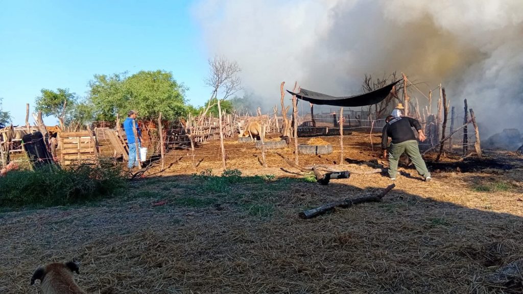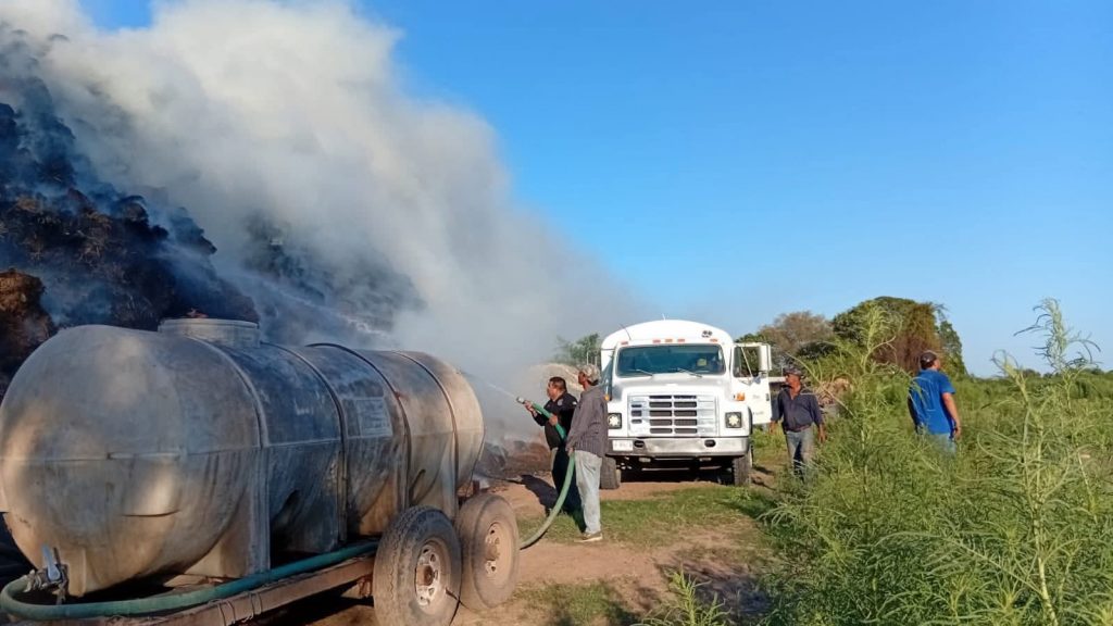 Etchojoa, Son.- La rápida y efectiva respuesta de los Bomberos de Etchojoa, bajo el mando del Comandante Reinaldo Amarillas Meza, en coordinación con, Servicios Públicos, Seguridad Pública Municipal y Estatal, evitó que un incendio de gran magnitud se propagara en el poblado de Bacame Viejo, donde más de 10 mil pacas de alimento para ganado quedaron reducidas a cenizas.