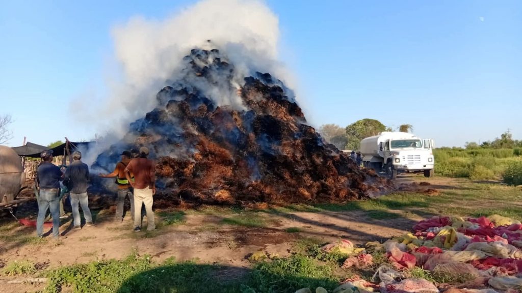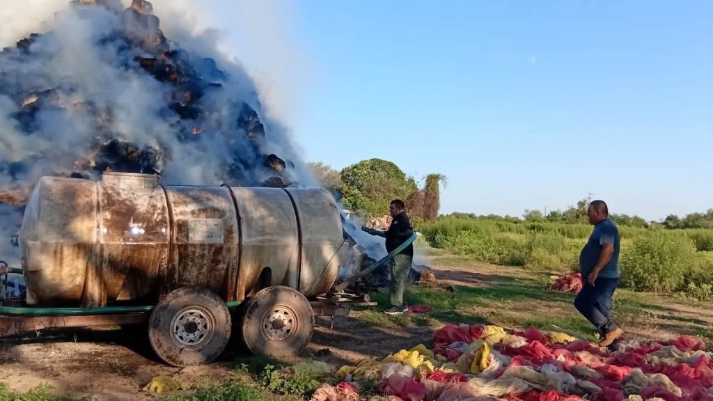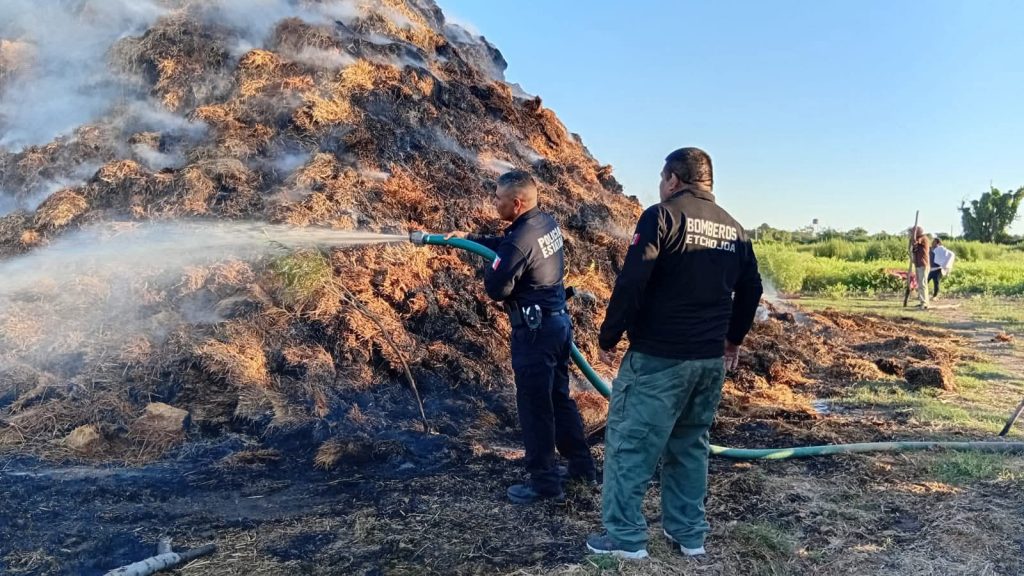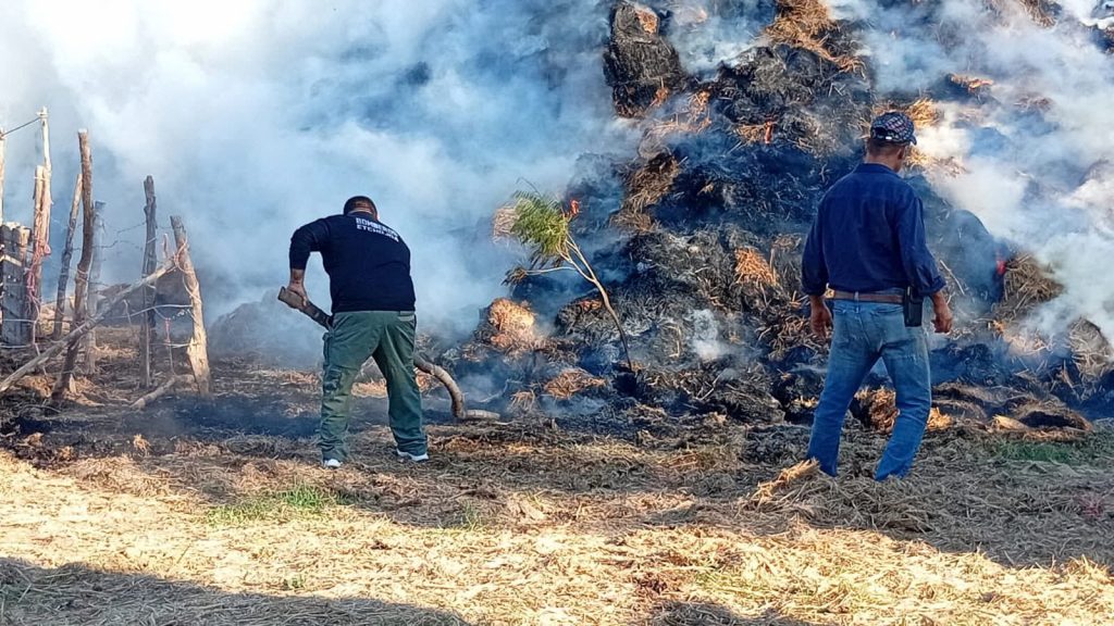 El siniestro se registró alrededor de las 3 de la tarde, cuando a través del número de emergencias 911 se reportó la quema accidental de pacas. De inmediato, los elementos del Cuerpo de Bomberos acudieron al lugar y, con el apoyo de una pipa de Servicios Públicos, lograron controlar las llamas que amenazaban con extenderse a otras 20 mil pacas almacenadas en la zona.