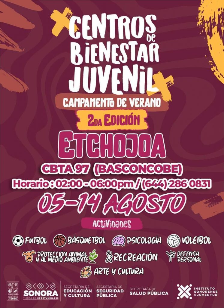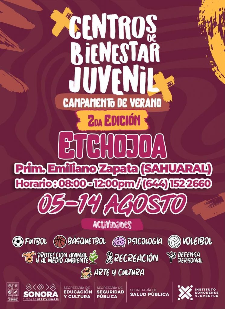 Etchojoa, Son.- El Gobierno Municipal junto con los Institutos Sonorense y Etchojoense de la Juventud, invitan a niñas, niños y Jóvenes adolescentes entre 7 y 12 años de edad, a participar en los campamentos de verano 2024 donde se realizarán diversas actividades como: