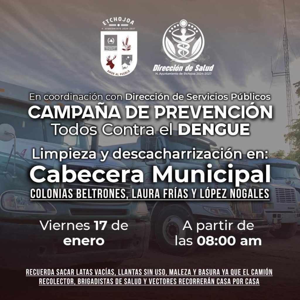 Este viernes 17 de enero a partir de las 08:00 am, el Gobierno Municipal en coordinación con la Dirección de Salud y Dirección de Servicios Públicos, realizarán recorridos en las colonias Beltrones, Laura Frías y López Nogales de la Cabecera Municipal, para llevar a cabo la Campaña de Limpieza y Descacharrización “Todos contra el Dengue”.