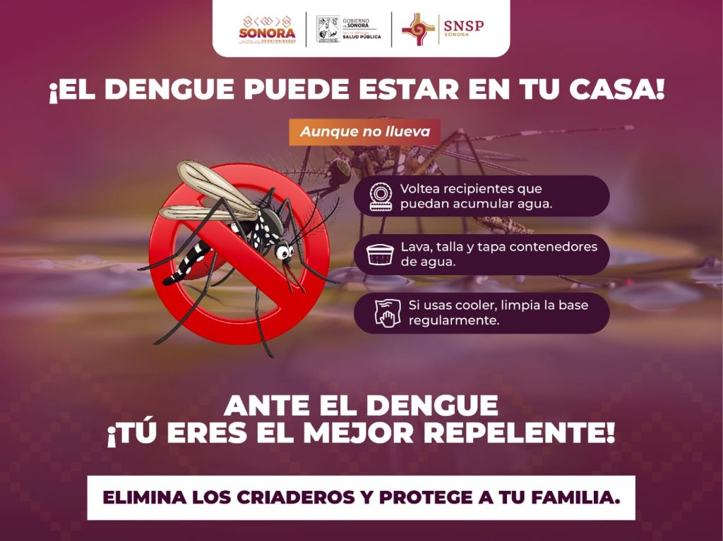 Sonora; 27 de noviembre de 2025.- Por nuestra salud y de nuestras familias, atacar el Dengue es tarea de todos; sigue los pasos recomendados por la Secretaría de Salud Sonora.