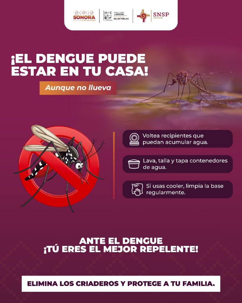 Sonora; 29 de noviembre de 2025.- El mosco transmisor del Dengue se reproduce aún fuera de la temporada de lluvias, solo basta una mínima cantidad de agua acumulada, cuidemos a nuestra familia siguiendo las medidas propuestas por la Secretaría de Salud Sonora.