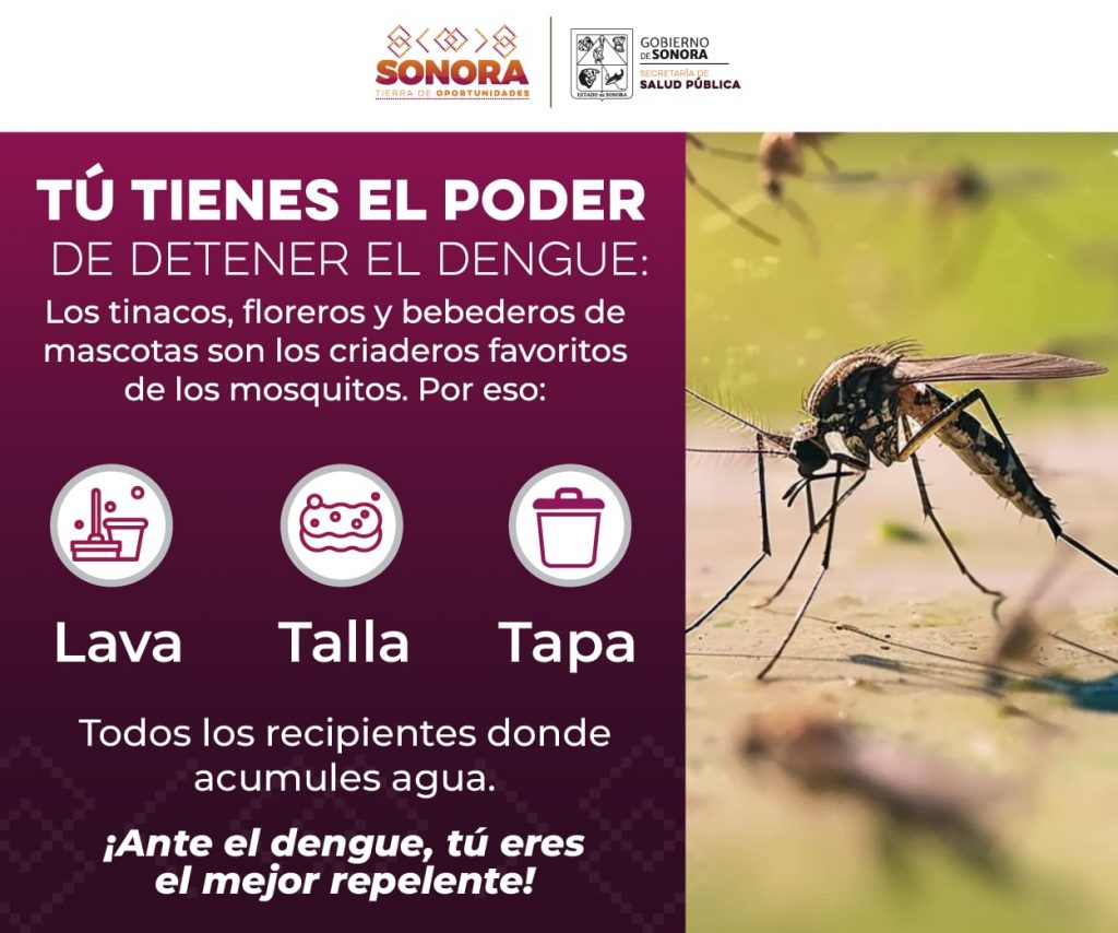 Sonora; 18 de diciembre de 2025.- Cuidemos la salud de nuestras familias apoyando a la Secretaría de Salud Sonora en el combate al Dengue; es fácil hacerlo desde nuestras casas, con solo mantener nuestros patios limpios y seguir las recomendaciones que sugieren las secretaria de salud y sus direcciones municipales.
