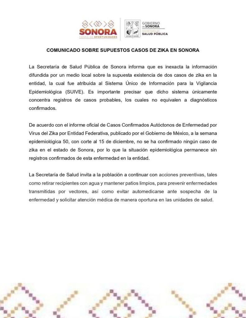COMUNICADO ESTATAL PRINCIPAL COMUNICADO DE LA SECRETARÍA DE SALUD SONORA. luis diaz llamita enero 4, 2026 #Zika Post navigation Previous Previous post: 🦟🚫 ¡Juntos contra el dengue!Next Next post: COMUNICADO DE LA Secretaría de Educación y Cultura. Deja un comentario Cancelar respuestaTu dirección de correo electrónico no será publicada. Los campos obligatorios están marcados con *Comentario * Nombre * Correo electrónico * Web Guardar mi nombre, correo electrónico y sitio web en este navegador para la próxima vez que haga un comentario.