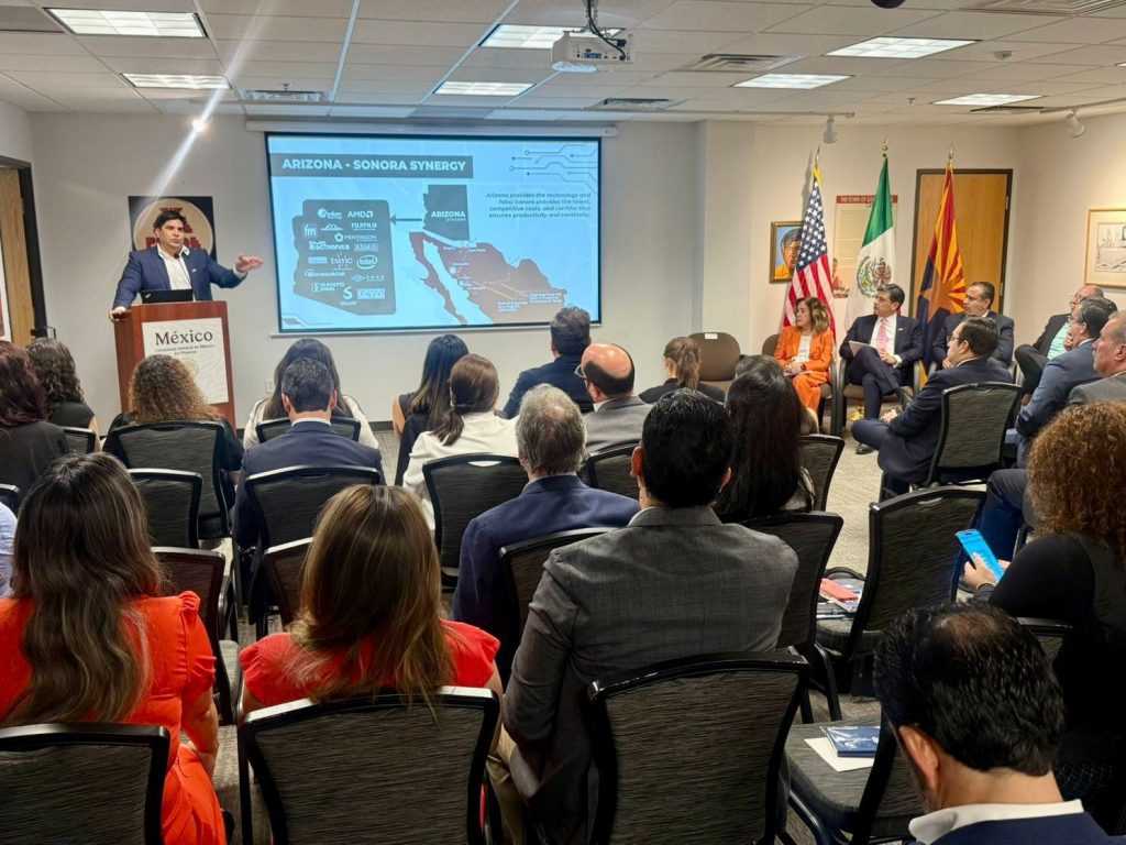 Phoenix, Arizona; 9 de octubre de 2025.- Bajo el liderazgo del Gobernador Alfonso Durazo Montaño, el Gobierno de Sonora consolida al estado como un socio estratégico de Norteamérica en la industria tecnológica- incluidos los semiconductores- y de energías limpias, expresó el presidente ejecutivo del Consejo para el Desarrollo Sostenible de Sonora (Codeso), Francisco Acuña Méndez, al presentar el Plan Sonora de Energías Sostenibles durante el foro “México Market Briefing”, en el marco de SEMICON West, realizado en Phoenix, Arizona.