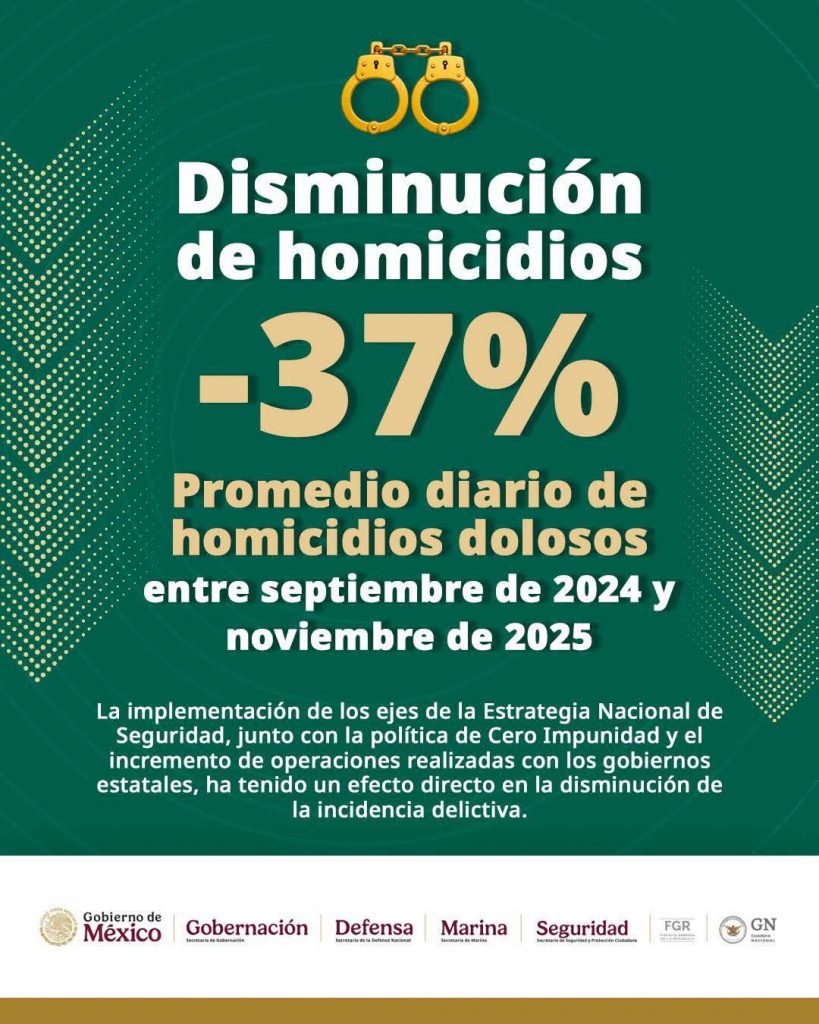 Omar García Harfuch, titular de la Secretaría de Seguridad y Protección Ciudadana, informó que de septiembre de 2024 a noviembre de 2025, el promedio diario de homicidios dolosos se ha reducido en un 37%.