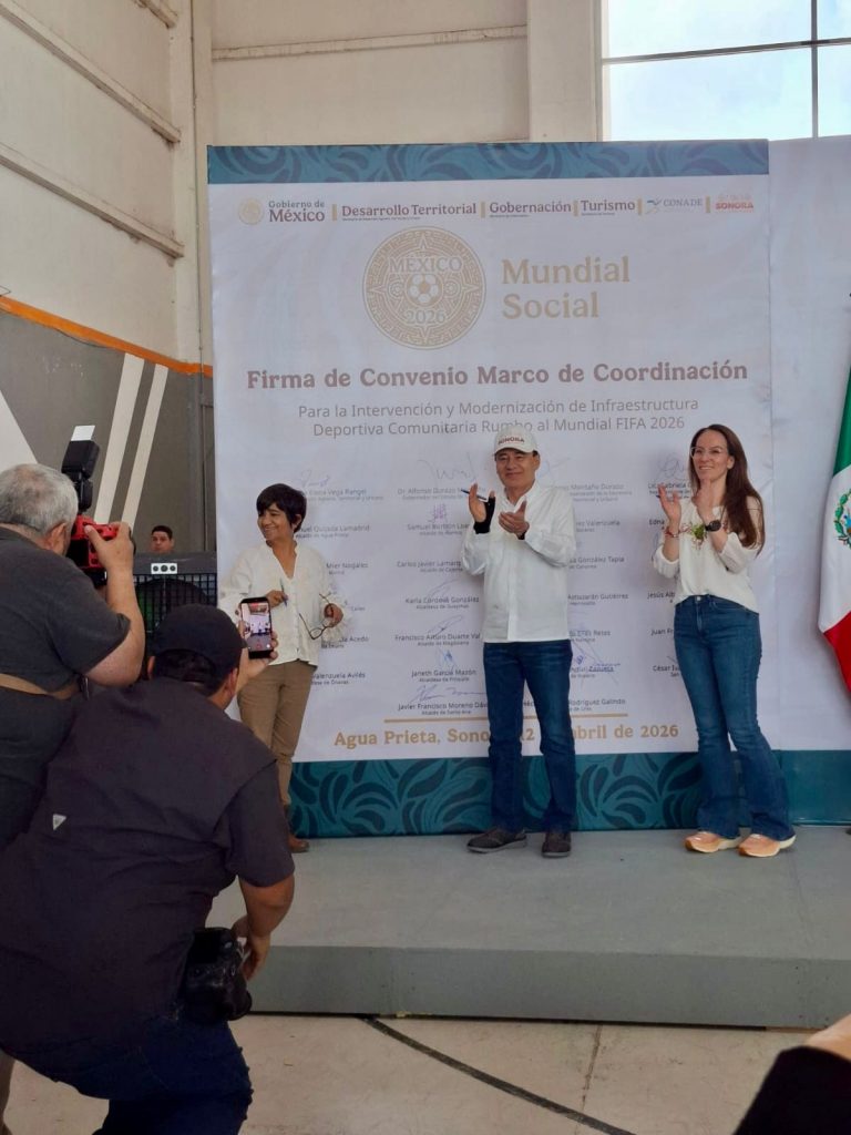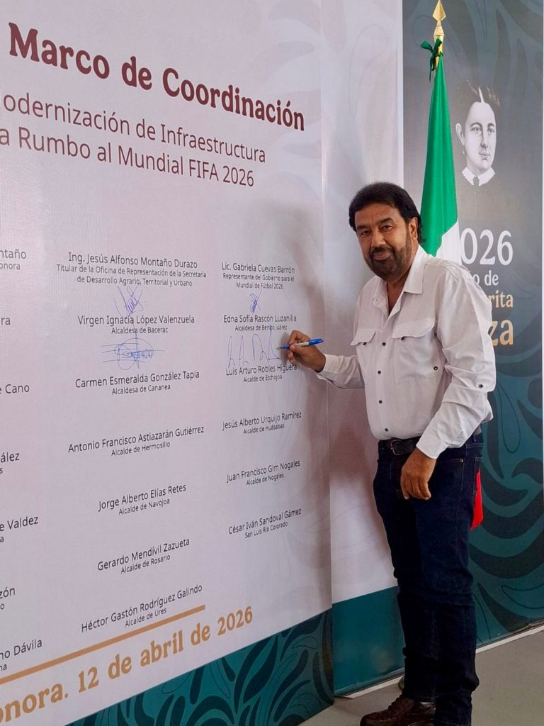 Etchojoa, adonde.- El alcalde, Ing. Luis Arturo Robles Higuera, acompañó al Gobernador de Sonora, Alfonso Durazo Montaño, en la firma del Convenio Rumbo al Mundial Social 2026, una iniciativa impulsada por la Secretaría de Desarrollo Agrario, Territorial y Urbano (SEDATU).