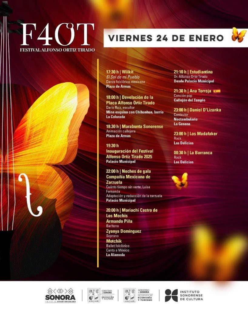 ALAMOS ARTE CULTURA ESTATAL FESTIVAL PRINCIPAL FAOT 2025 luis diaz llamita enero 24, 2025 Sonora; 24 de enero de 2025.- Hoy inicia el Festival Alfonso Ortiz Tirado en so 40 aniversario. Continue Reading Previous Previous post: Celebra Gobernador Durazo el 40 aniversario del FAOT con un programa inaugural de lujo.Next Next post: En Caborca, AMIC y DEFENSA detiene a 11 personas en posesión de armas de fuego. Deja un comentario Cancelar respuestaTu dirección de correo electrónico no será publicada. Los campos obligatorios están marcados con *Comentario * Nombre * Correo electrónico * Web Guardar mi nombre, correo electrónico y sitio web en este navegador para la próxima vez que haga un comentario.