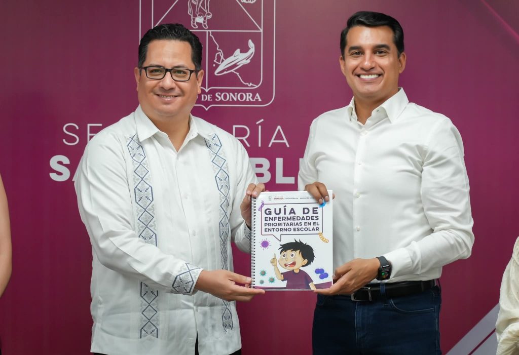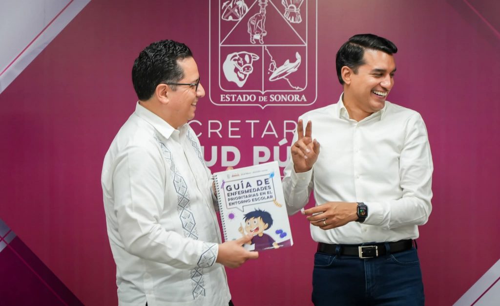Se entrega la Guía de Enfermedades Prioritarias en el Entorno Escolar, por el Dr. José Luis Alomía Zegarra, de la Secretaría de Salud Sonora y Froylán Gámez Gamboa, titular de la Secretaría de Educación y Cultura