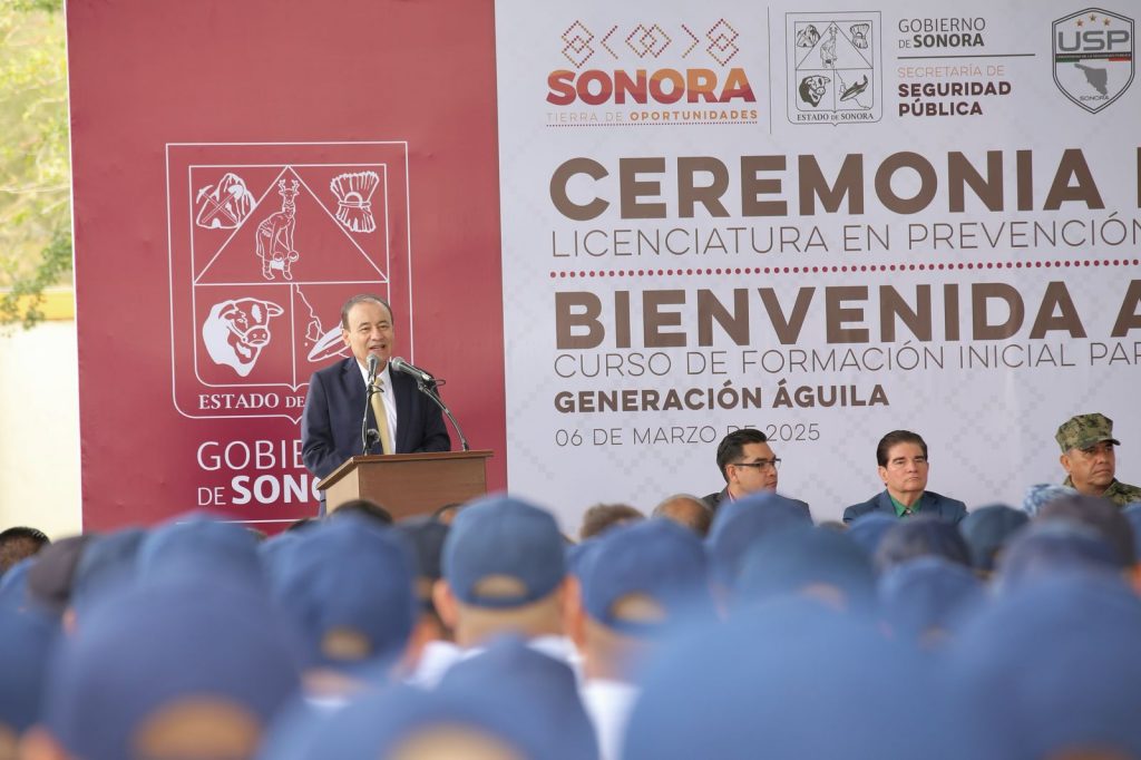 Hermosillo, Sonora; 6 de marzo de 2025.- Como resultado de su compromiso con la formación de profesionales en seguridad, el Gobernador Alfonso Durazo Montaño encabezó la ceremonia de graduación de 48 estudiantes de la Licenciatura en Prevención del Delito y Seguridad Ciudadana, y dio la bienvenida a los 307 cadetes que ingresaron a Formación Inicial para Policía de Proximidad, Generación Águila, en febrero de 2025.