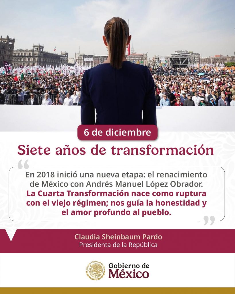Durante la celebración por siete años de transformación, la presidenta Claudia Sheinbaum Pardo afirma que el movimiento de la 4T construye una nueva ética y avanza con dignidad, justicia, unidad y la fuerza invencible del pueblo de México.