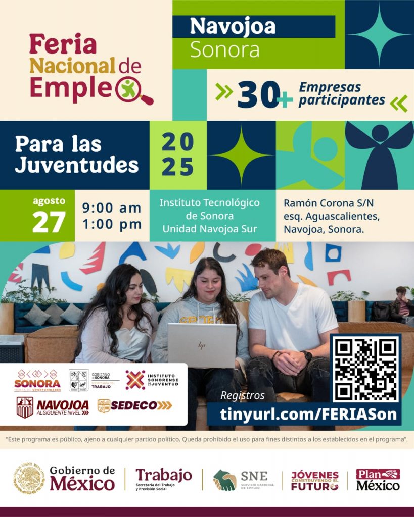 Navojoa, Sonora, 19 de agosto 2025.- El próximo miércoles 27 de este mes tendrá lugar la “Feria del Empleo para las Juventudes Navojoa 2025”, donde habrá oferta de más de 350 vacantes, evento respaldado por el gobierno del alcalde Jorge Alberto Elías Retes, y en coordinación con los Servicios Nacional y Estatal del Empleo, Instituto de la Juventud y cámaras empresariales.