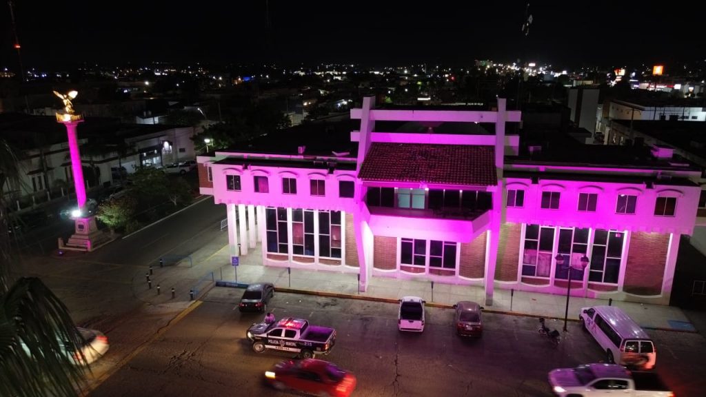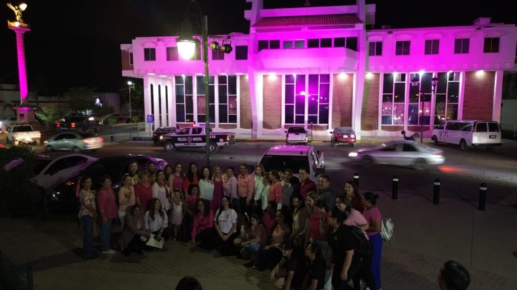 Navojoa, Sonora, 1 de octubre 2025.- Al quedar iluminados de rosa edificios públicos como el Palacio Municipal, el Ángel de la Independencia y el monumento de los Tres Picos, Navojoa exaltó este miércoles la esperanza y solidaridad de la comunidad en la lucha contra el cáncer de mama en el mes de octubre.