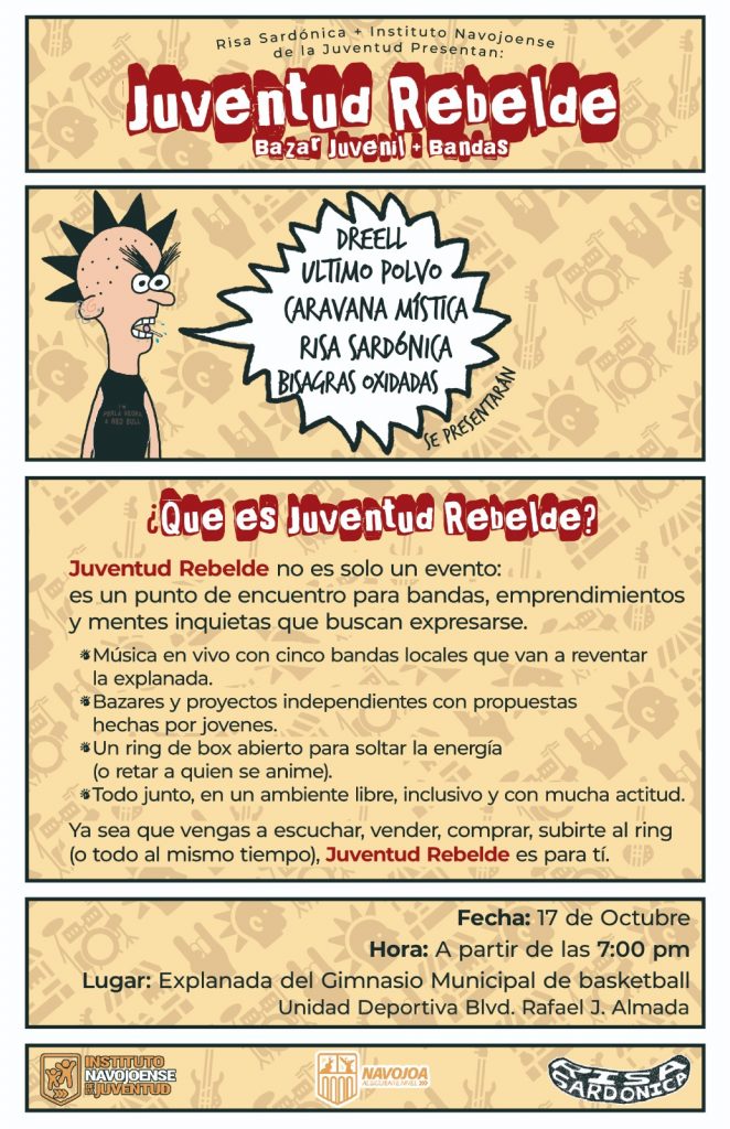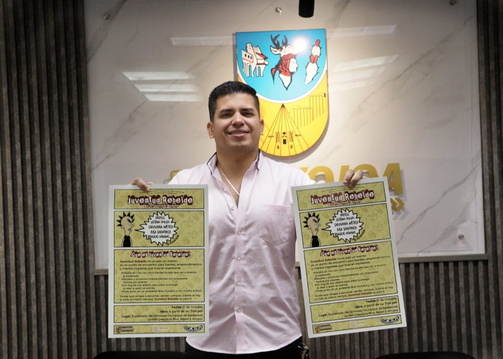 Navojoa, Sonora, 16 de octubre 2025.- A disfrutar del evento “Juventud Rebelde” mañana viernes 17 en la explanada del Gimnasio Municipal, donde habrá música de bandas de rock, stand de emprendedores y se premiará a 15 ganadores del concurso “Premio Municipal de la Juventud”, invitó este miércoles a todos los navojoenses el gobierno del alcalde Jorge Alberto Elías Retes.
