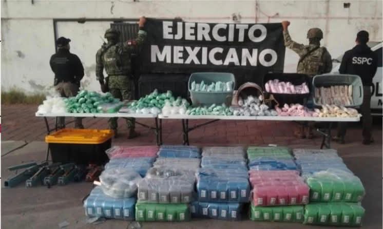 Durante el operativo encabezado por elementos del Ejército Mexicano en coordinación con autoridades estatales, fueron decomisados 25.690 kilos de metanfetamina y 26.640 kilos de cocaína, además de seis selladoras y 26 bultos de bolsas para empaque.