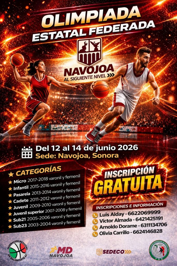 Navojoa, Sonora, 22 de abril 2026.- Fortaleciéndose como pionero en el turismo deportivo en la entidad, Navojoa será sede del 12 al 14 de junio próximo de la Olimpiada Estatal Federada de Basquetbol, donde participarán más de 50 equipos para selección a fase nacional, evento impulsado por el gobierno del alcalde Jorge Alberto Elías Retes en coordinación con la Federación Sonorense de Basquetbol.