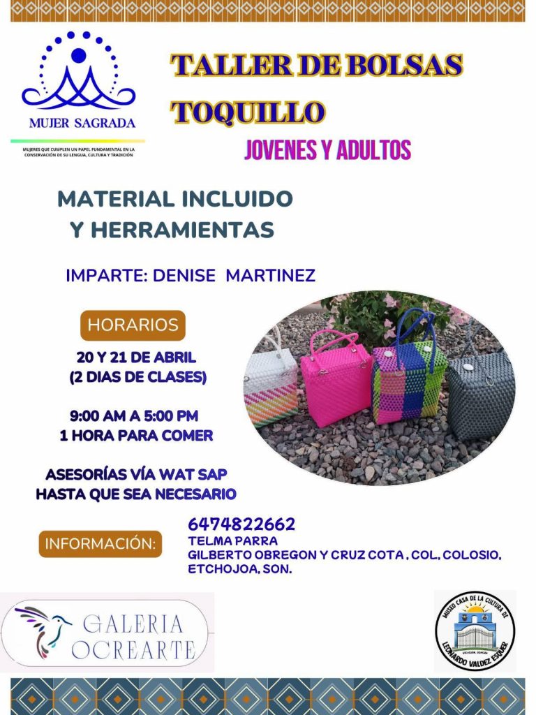 Asimismo, jóvenes y adultos podrán participar en el Taller de Bolsas Toquillo, impartido por Denise Martínez, programado para los días 20 y 21 de abril, de 9:00 de la mañana a 5:00 de la tarde, con una hora para comida y asesorías vía WhatsApp hasta que sea necesario.