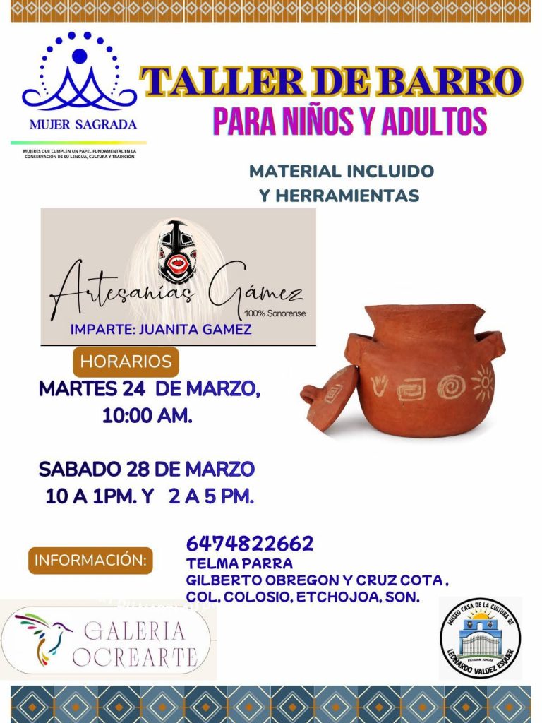 Entre las actividades programadas se encuentra el Taller de Barro, impartido por la artesana Juanita Gámez, con material y herramientas incluidos. Las sesiones se llevarán a cabo el martes 24 de marzo a las 10:00 de la mañana, así como el sábado 28 de marzo de 10:00 AM a 1:00 PM y de 2:00 a 5:00 PM.