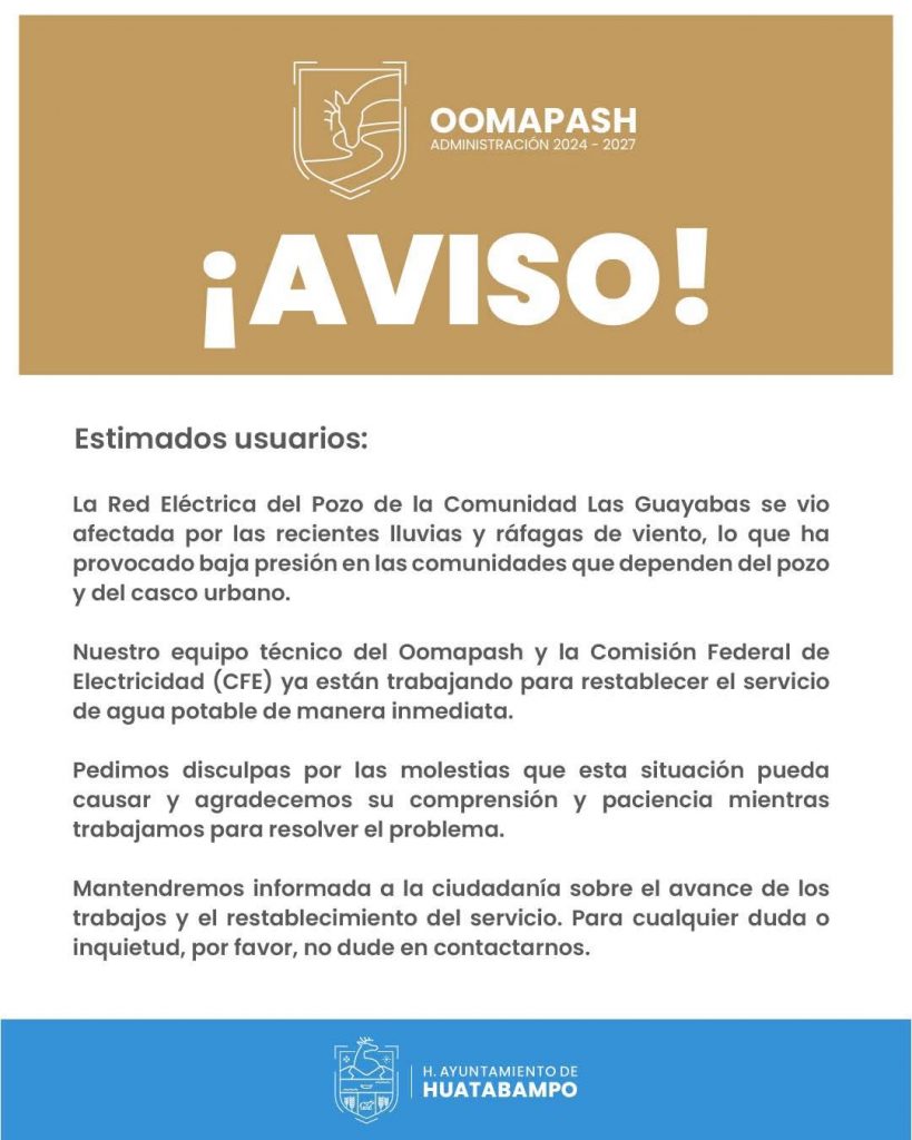 AGUA HUATABAMPO PRINCIPAL POZO DE “LAS GUAYABAS” AFECTADOS POR LLUVIAS Y VIENTOS. luis diaz llamita junio 2, 2025 Oomapas Huatabampo emite comunicado. Continue Reading Previous Previous post: ALERTA CARRETERA POR ACCIDENTE DE AUTOBÚS.Next Next post: Atención estudiantes de universidades públicas en Navojoa. Deja un comentario Cancelar respuestaTu dirección de correo electrónico no será publicada. Los campos obligatorios están marcados con *Comentario * Nombre * Correo electrónico * Web Guardar mi nombre, correo electrónico y sitio web en este navegador para la próxima vez que haga un comentario.