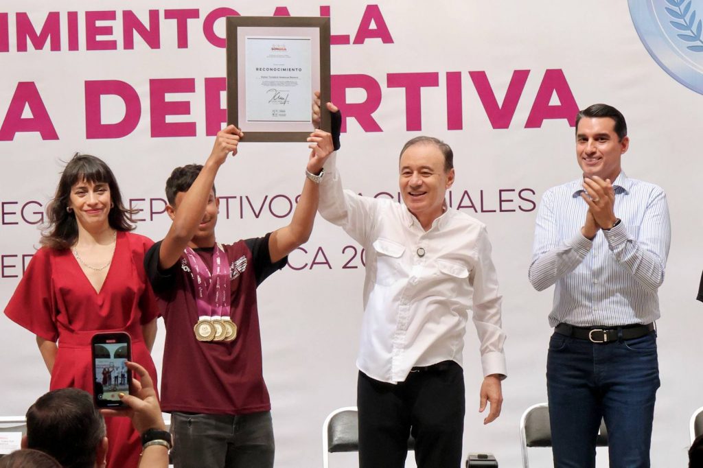 - Durante la ceremonia en la que fueron galardonados los deportistas, el mandatario estatal resaltó que Sonora alcanzó un total de 54 medallas, de las cuales 17 son de oro, 16 de plata, y 21 de bronce.