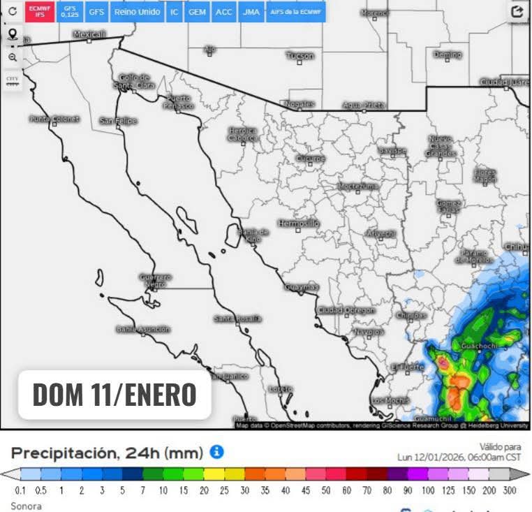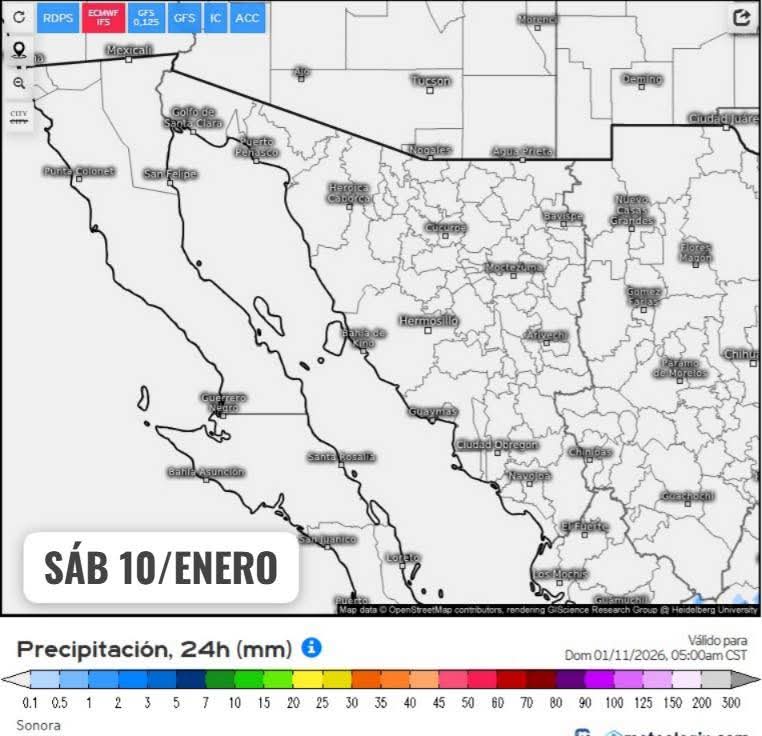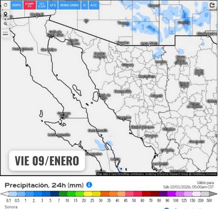 Para hoy, persistirán los efectos de la masa de aire polar asociada al frente generando un ambiente de gélido a muy frío sobre la región montañosa de Sonora con temperaturas mínimas desde los -5°C a los 0°C. A su vez, en combinación con una vaguada en altura y la corriente en chorro subtropical ocasionarán rachas de viento fuertes (+75 km/) sobre toda la línea costera del estado, así como la región montañosa del este.