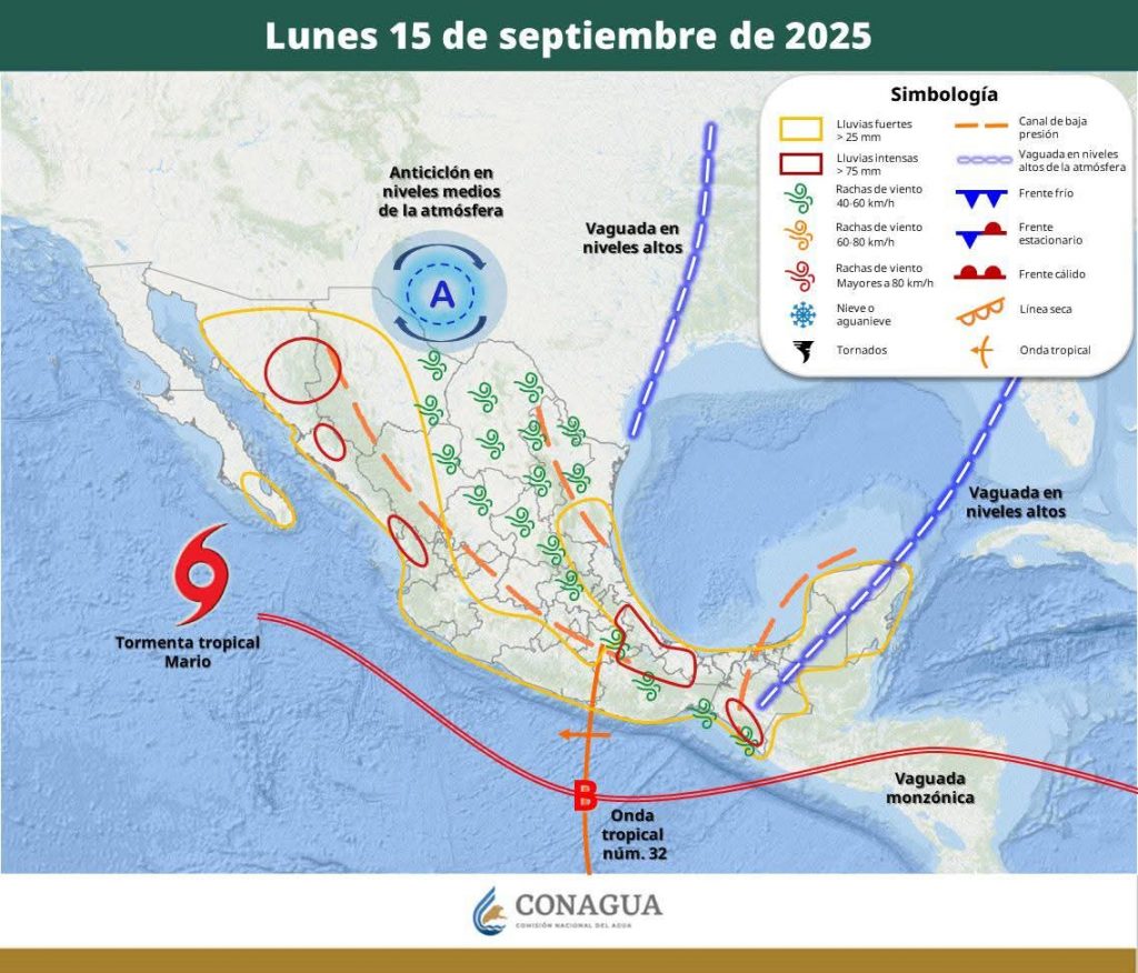 Los efectos del monzón mexicano en interacción con una circulación ciclónica en niveles medios de la atmósfera y divergencia ocasionarán tormentas eléctricas con lluvias ligeras a moderadas (20 a 75mm) y fuertes rachas de viento (+60 km/h) sobre el norte, centro, noreste, noroeste, este y sur en horario vespertino. A su vez, las bandas nubosas del sistema tropical “Mario” reforzarán la probabilidad de lluvia dentro del estado aumentando el flujo de humedad para ser aprovechado por el monzón.