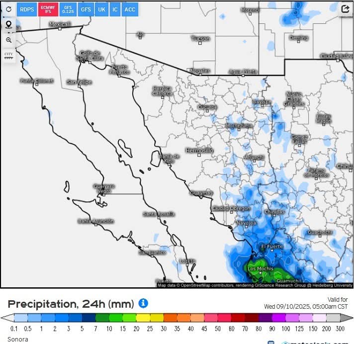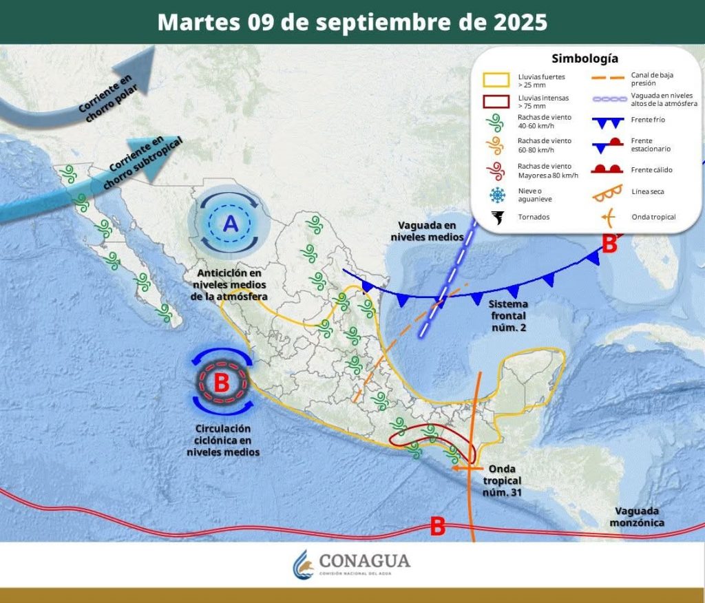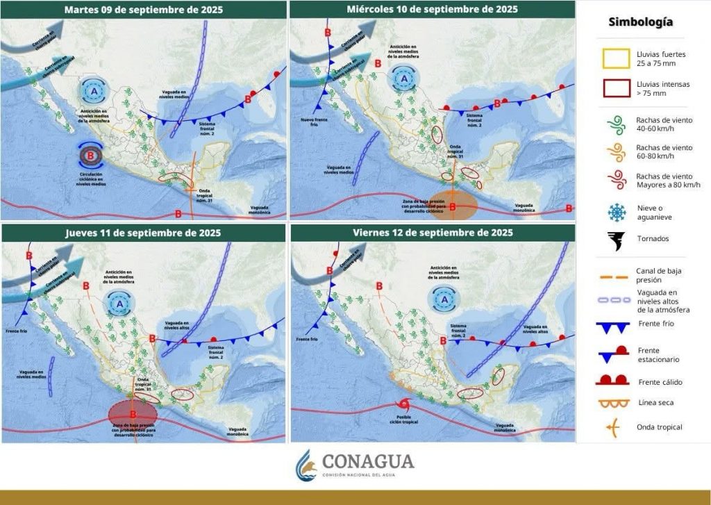 Hermosillo, Sonora a 09 de septiembre de 2025.- Martes, basándose en la valoración y análisis de la información meteorológica en general y con base en información del Servicio Meteorológico Nacional y diferentes fuentes oficiales de los Estados Unidos, la Coordinación Estatal de Proteccion Civil emite el siguiente pronóstico: