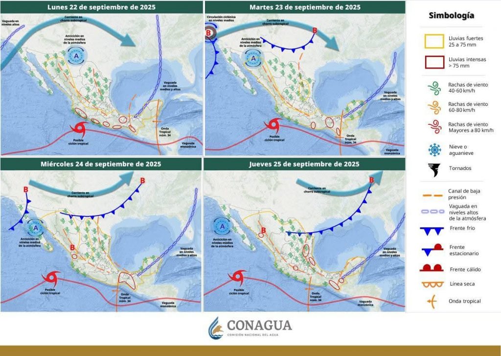 Por otro lado, un nuevo frente frío se aproximará sobre la frontera noroeste del país durante los días 25 y 26 de septiembre ocasionando, fuertes rachas de viento y un descenso ligero en las temperaturas en el estado de Sonora.