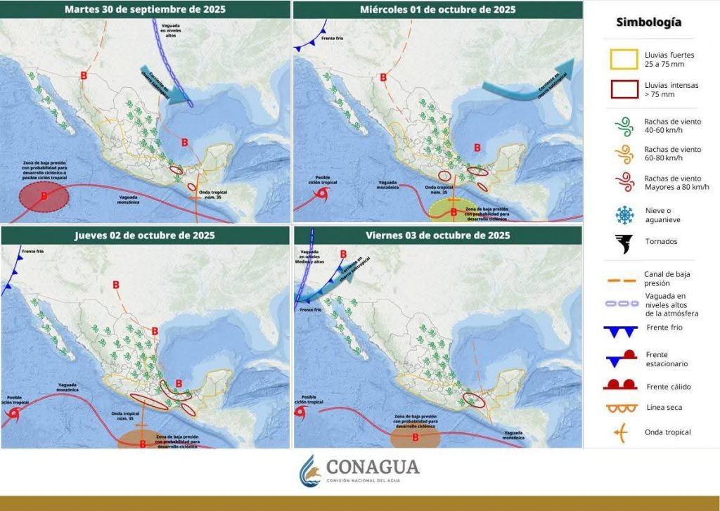 Por otro lado, un nuevo frente frío se aproximará a la frontera noroeste del país durante los días 03 y 04 de octubre, ocasionando rachas de viento moderadas y un ligero descenso en las temperaturas durante el periodo.