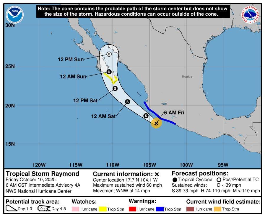 A su vez, un se mantiene en vigilancia la tormenta tropical “Raymond”. Dicho sistema mantiene una tendencia de trayectoria hacia el noroeste del país, por lo que mantiene alta probabilidad de ocasionar precipitaciones fuertes a muy fuertes durante el próximo fin de semana en todo el estado de Sonora. Aunado a esto, generará un aumento en la velocidad de los vientos con rachas de 70 a 90 km/h sobre la línea costera sur, así como oleaje de 3 a 5 metros en municipios costeros y comunidades pesqueras.