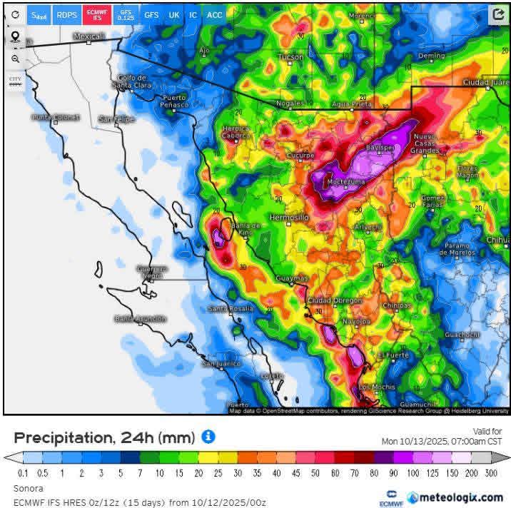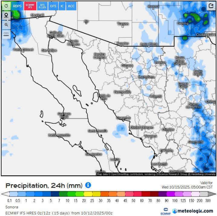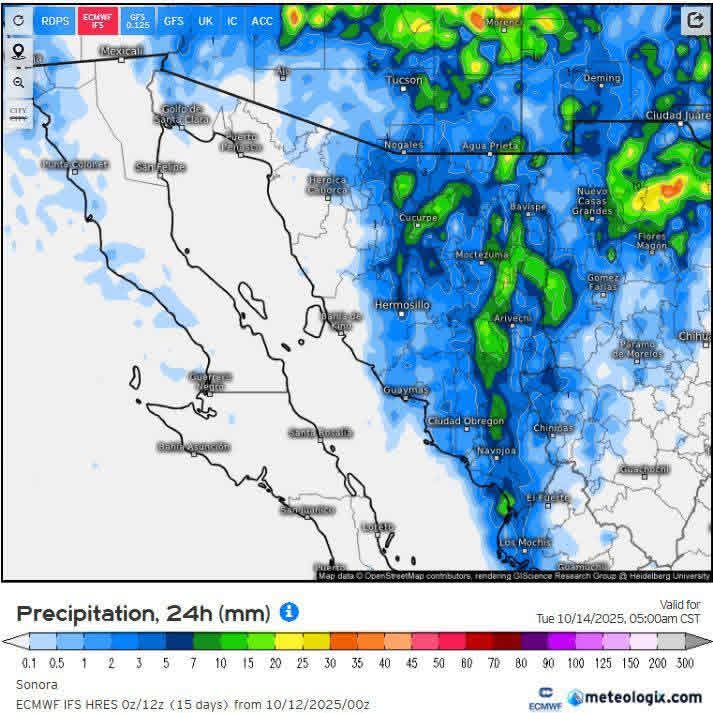 Hermosillo, Sonora a 12 de octubre de 2025.- Domingo, basándose en la valoración y análisis de la información meteorológica en general y con base en información del Servicio Meteorológico Nacional y diferentes fuentes oficiales de los Estados Unidos, la Coordinación Estatal de Protección Civil emite el siguiente pronóstico: