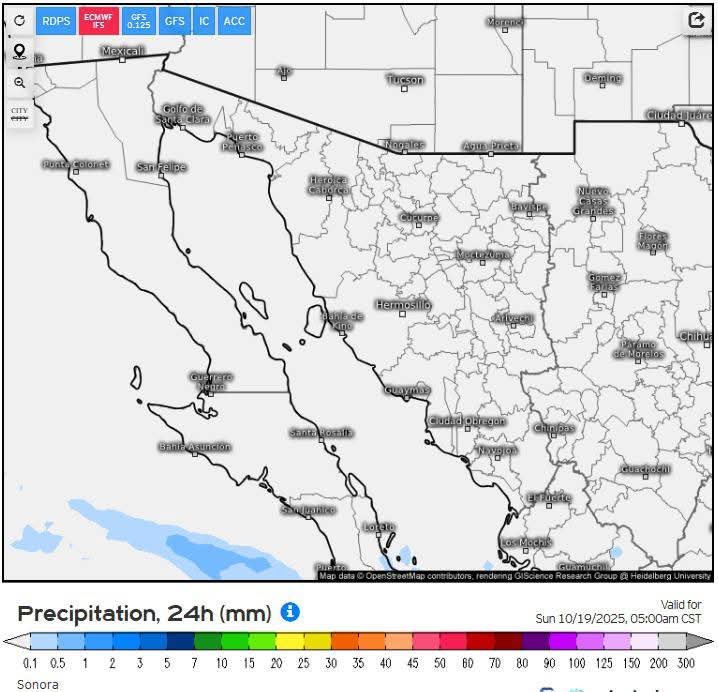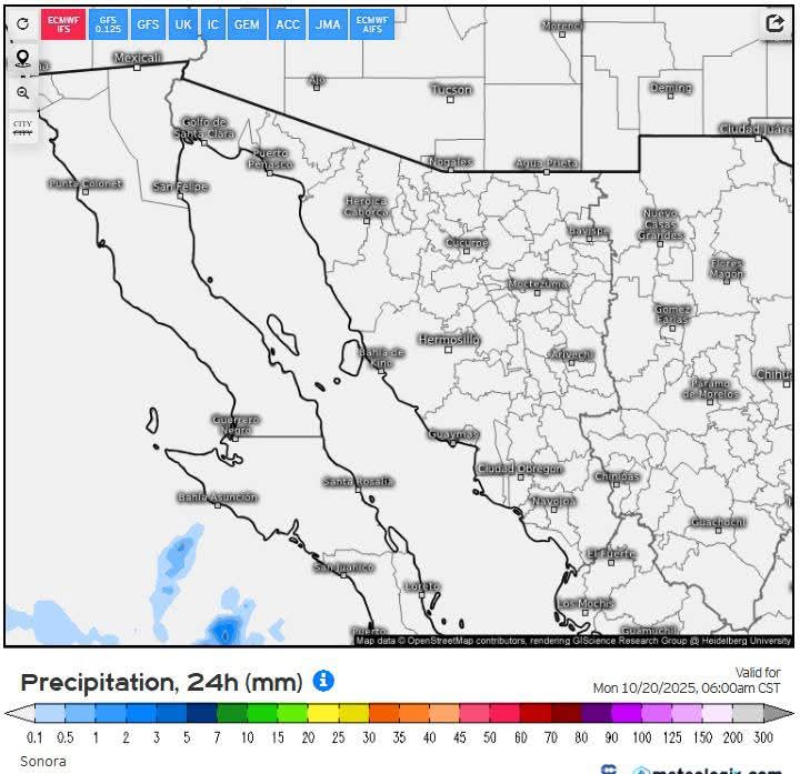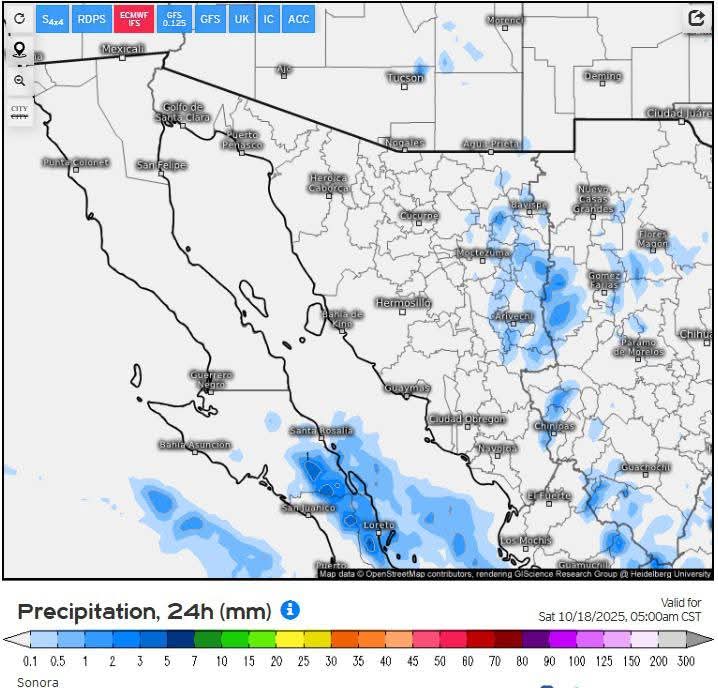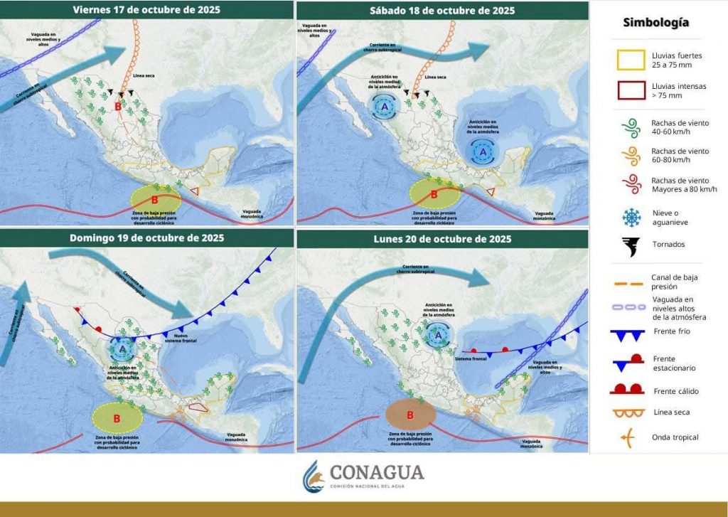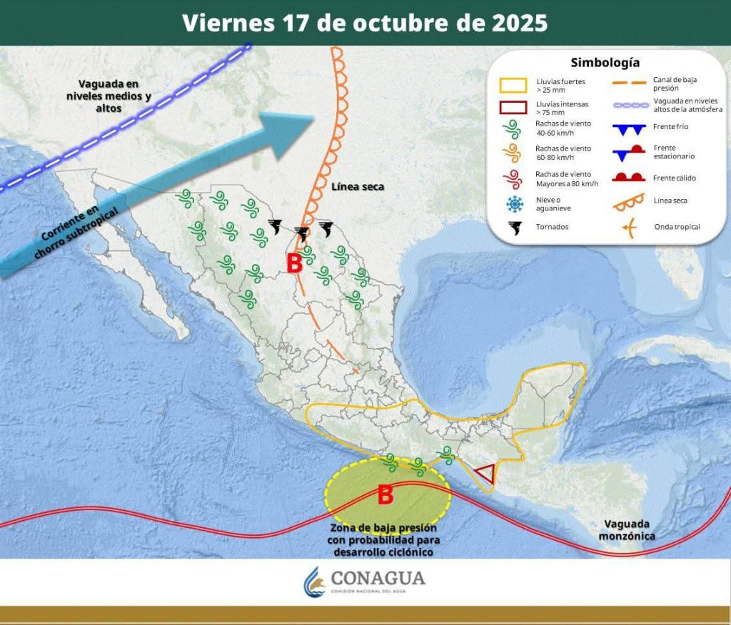 Hermosillo, Sonora a 17 de octubre de 2025.- Viernes, basándose en la valoración y análisis de la información meteorológica en general y con base en información del Servicio Meteorológico Nacional y diferentes fuentes oficiales de los Estados Unidos, la Coordinación Estatal de Protección Civil emite el siguiente pronóstico:
