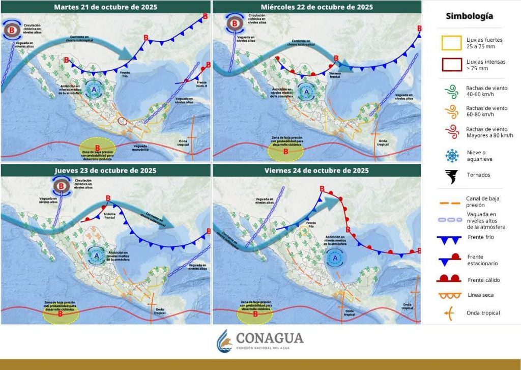 Por otro lado, se prevé la aproximación de un nuevo frente frío durante el 28 de octubre, generando un ligero descenso en las temperaturas, así como rachas de viento moderadas en el noroeste del estado.